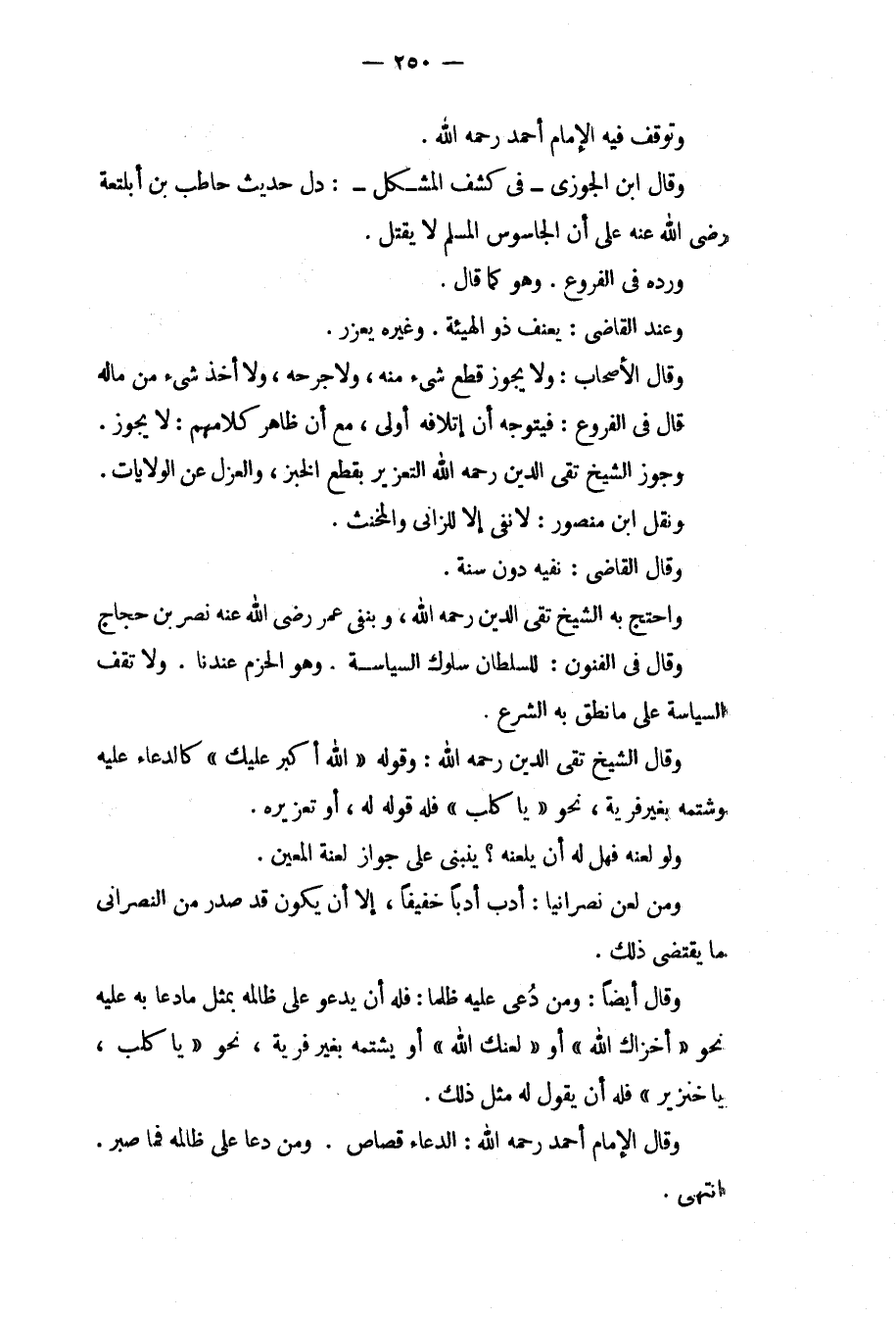 وَتَوَقَّفَ فِيهِ الْإِمَامُ أَحْمَدُ - رَحِمَهُ اللَّهُ -. وَقَالَ ابْنُ الْجَوْزِيِّ فِي كَشْفِ الْمُشْكِلِ: دَلَّ حَدِيثُ حَاطِبِ بْنِ أَبِي بَلْتَعَةَ - رَضِيَ اللَّهُ عَنْهُ - عَلَى أَنَّ الْجَاسُوسَ الْمُسْلِمَ لَا يُقْتَلُ. وَرَدَّهُ فِي الْفُرُوعِ. وَهُوَ كَمَا قَالَ. وَعِنْدَ الْقَاضِي: يُعَنَّفُ ذُو الْهَيْئَةِ. وَغَيْرُهُ يُعَزَّرُ. وَقَالَ الْأَصْحَابُ: وَلَا يَجُوزُ قَطْعُ شَيْءٍ مِنْهُ، وَلَا جَرْحُهُ، وَلَا أَخْذُ شَيْءٍ مِنْ مَالِهِ قَالَ فِي الْفُرُوعِ: فَيُتَوَجَّهُ أَنَّ إتْلَافَهُ أَوْلَى، مَعَ أَنَّ ظَاهِرَ كَلَامِهِمْ: لَا يَجُوزُ. وَجَوَّزَ الشَّيْخُ تَقِيُّ الدِّينِ - رَحِمَهُ اللَّهُ - التَّعْزِيرَ بِقَطْعِ الْخُبْزِ، وَالْعَزْلِ عَنْ الْوِلَايَاتِ. وَنَقَلَ ابْنُ مَنْصُورٍ: لَا نَفْيَ إلَّا لِلزَّانِي وَالْمُخَنَّثِ.