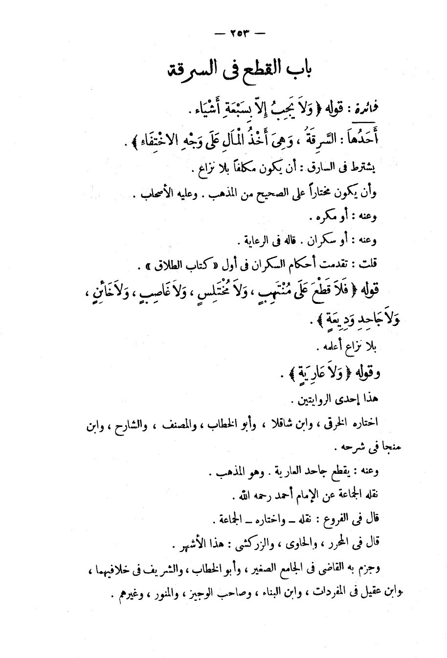 ِ فَائِدَةٌ: قَوْلُهُ (وَلَا يَجِبُ إلَّا بِسَبْعَةِ أَشْيَاءَ. أَحَدُهَا: السَّرِقَةُ، وَهِيَ أَخْذُ الْمَالِ عَلَى وَجْهِ الِاخْتِفَاءِ) . يُشْتَرَطُ فِي السَّارِقِ: أَنْ يَكُونَ مُكَلَّفًا بِلَا نِزَاعٍ. وَأَنْ يَكُونَ مُخْتَارًا عَلَى الصَّحِيحِ مِنْ الْمَذْهَبِ. وَعَلَيْهِ الْأَصْحَابُ. وَعَنْهُ: أَوْ مُكْرَهًا. وَعَنْهُ: أَوْ سَكْرَانَ. قَالَهُ فِي الرِّعَايَةِ. قُلْت: تَقَدَّمَتْ أَحْكَامُ السَّكْرَانِ فِي أَوَّلِ " كِتَابِ الطَّلَاقِ ".