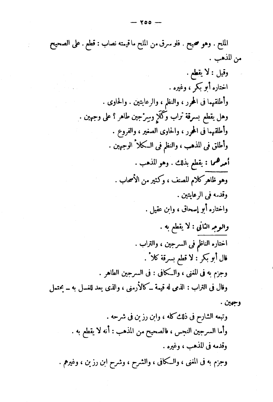 أَحَدُهُمَا: يُقْطَعُ بِذَلِكَ. وَهُوَ الْمَذْهَبُ. وَهُوَ ظَاهِرُ كَلَامِ الْمُصَنِّفِ، وَكَثِيرٍ مِنْ الْأَصْحَابِ، وَقَدَّمَهُ فِي الرِّعَايَتَيْنِ، وَاخْتَارَهُ أَبُو إِسْحَاقَ، وَابْنُ عَقِيلٍ. وَالْوَجْهُ الثَّانِي: لَا يُقْطَعُ بِهِ، اخْتَارَهُ النَّاظِمُ فِي السِّرْجِينِ، وَالتُّرَابِ. قَالَ أَبُو بَكْرٍ: لَا قَطْعَ بِسَرِقَةِ كَلَأٍ، وَجَزَمَ بِهِ فِي الْمُغْنِي، وَالْكَافِي: فِي السِّرْجِينِ الطَّاهِرِ. وَقَالَ فِي التُّرَابِ: الذِّمِّيُّ لَهُ قِيمَةٌ كَالْأَرْمَنِيِّ، وَاَلَّذِي يُعَدُّ لِلْغَسْلِ بِهِ يَحْتَمِلُ وَجْهَيْنِ. وَتَبِعَهُ الشَّارِحُ فِي ذَلِكَ كُلِّهِ، وَابْنُ رَزِينٍ فِي شَرْحِهِ. وَأَمَّا السَّرْجِينُ النَّجِسُ، فَالصَّحِيحُ مِنْ الْمَذْهَبِ: أَنَّهُ لَا يُقْطَعُ بِهِ، وَقَدَّمَهُ فِي الْمُذْهَبِ، وَغَيْرِهِ، وَجَزَمَ بِهِ فِي الْمُغْنِي، وَالْكَافِي، وَالشَّرْحِ، وَشَرْحِ ابْنِ رَزِينٍ، وَغَيْرِهِمْ.