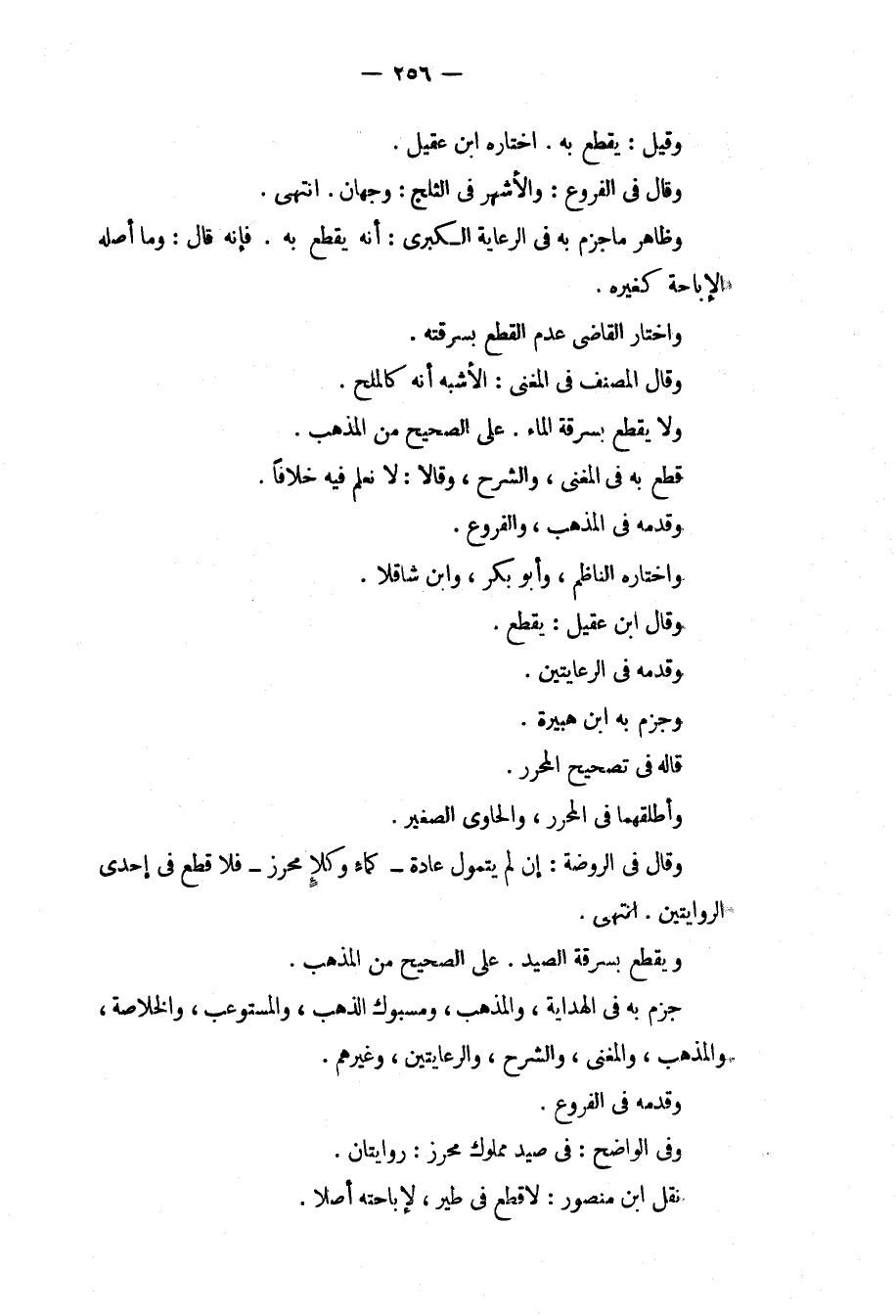 وَقِيلَ: يُقْطَعُ بِهِ، اخْتَارَهُ ابْنُ عَقِيلٍ. وَقَالَ فِي الْفُرُوعِ: وَالْأَشْهَرُ فِي الثَّلْجِ: وَجْهَانِ. انْتَهَى. وَظَاهِرُ مَا جَزَمَ بِهِ فِي الرِّعَايَةِ الْكُبْرَى: أَنَّهُ يُقْطَعُ بِهِ. فَإِنَّهُ قَالَ: وَمَا أَصْلُهُ الْإِبَاحَةُ كَغَيْرِهِ، وَاخْتَارَ الْقَاضِي عَدَمَ الْقَطْعِ بِسَرِقَتِهِ. وَقَالَ الْمُصَنِّفُ فِي الْمُغْنِي: الْأَشْبَهُ أَنَّهُ كَالْمِلْحِ. وَلَا يُقْطَعُ بِسَرِقَةِ الْمَاءِ عَلَى الصَّحِيحِ مِنْ الْمَذْهَبِ، قَطَعَ بِهِ فِي الْمُغْنِي، وَالشَّرْحِ، وَقَالَا: لَا نَعْلَمُ فِيهِ خِلَافًا، وَقَدَّمَهُ فِي الْمُذْهَبِ، وَالْفُرُوعِ، وَاخْتَارَهُ النَّاظِمُ، وَأَبُو بَكْرٍ، وَابْنُ شَاقِلَا. وَقَالَ ابْنُ عَقِيلٍ: يُقْطَعُ، وَقَدَّمَهُ فِي الرِّعَايَتَيْنِ، وَجَزَمَ بِهِ ابْنُ هُبَيْرَةَ. قَالَهُ فِي تَصْحِيحِ الْمُحَرَّرِ. وَأَطْلَقَهُمَا فِي الْمُحَرَّرِ، وَالْحَاوِي الصَّغِيرِ. وَقَالَ فِي الرَّوْضَةِ: إنْ لَمْ يَتَمَوَّلْ عَادَةً كَمَاءٍ وَكَلَإٍ مُحَرَّزٍ فَلَا قَطْعَ فِي إحْدَى الرِّوَايَتَيْنِ. انْتَهَى. وَيُقْطَعُ بِسَرِقَةِ الصَّيْدِ. عَلَى الصَّحِيحِ مِنْ الْمَذْهَبِ، جَزَمَ بِهِ فِي الْهِدَايَةِ، وَالْمُذْهَبِ، وَمَسْبُوكِ الذَّهَبِ، وَالْمُسْتَوْعِبِ، وَالْخُلَاصَةِ، وَالْمُذْهَبِ، وَالْمُغْنِي، وَالشَّرْحِ، وَالرِّعَايَتَيْنِ، وَغَيْرِهِمْ. وَقَدَّمَهُ فِي الْفُرُوعِ. وَفِي الْوَاضِحِ: فِي صَيْدِ مَمْلُوكٍ مُحَرَّزٍ: رِوَايَتَانِ. نَقَلَ ابْنُ مَنْصُورٍ: لَا قَطْعَ فِي طَيْرٍ، لِإِبَاحَتِهِ أَصْلًا