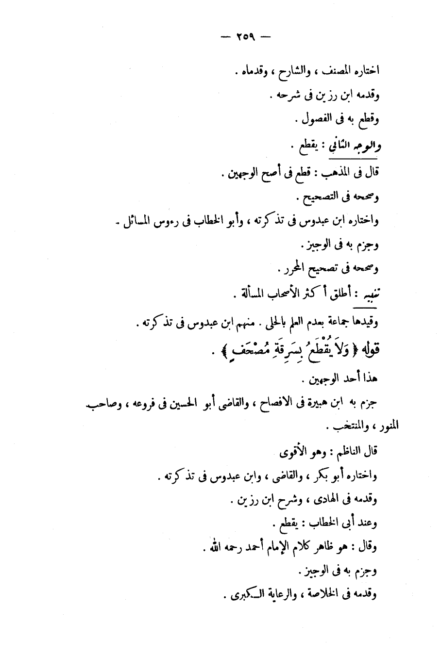 قَوْلُهُ (وَلَا يُقْطَعُ بِسَرِقَةِ مُصْحَفٍ) . هَذَا أَحَدُ الْوَجْهَيْنِ، جَزَمَ بِهِ ابْنُ هُبَيْرَةَ فِي الْإِفْصَاحِ، وَالْقَاضِي أَبُو الْحُسَيْنِ فِي فُرُوعِهِ، وَصَاحِبُ. الْمُنَوِّرِ، وَالْمُنْتَخَبِ. قَالَ النَّاظِمُ: وَهُوَ الْأَقْوَى، وَاخْتَارَهُ أَبُو بَكْرٍ، وَالْقَاضِي، وَابْنُ عَبْدُوسٍ فِي تَذْكِرَتِهِ. وَقَدَّمَهُ فِي الْهَادِي، وَشَرْحِ ابْنِ رَزِينٍ. وَعِنْدَ أَبِي الْخَطَّابِ: يُقْطَعُ. وَقَالَ: هُوَ ظَاهِرُ كَلَامِ الْإِمَامِ أَحْمَدَ - رَحِمَهُ اللَّهُ -، وَجَزَمَ بِهِ فِي الْوَجِيزِ، وَقَدَّمَهُ فِي الْخُلَاصَةِ، وَالرِّعَايَةِ الْكُبْرَى.
