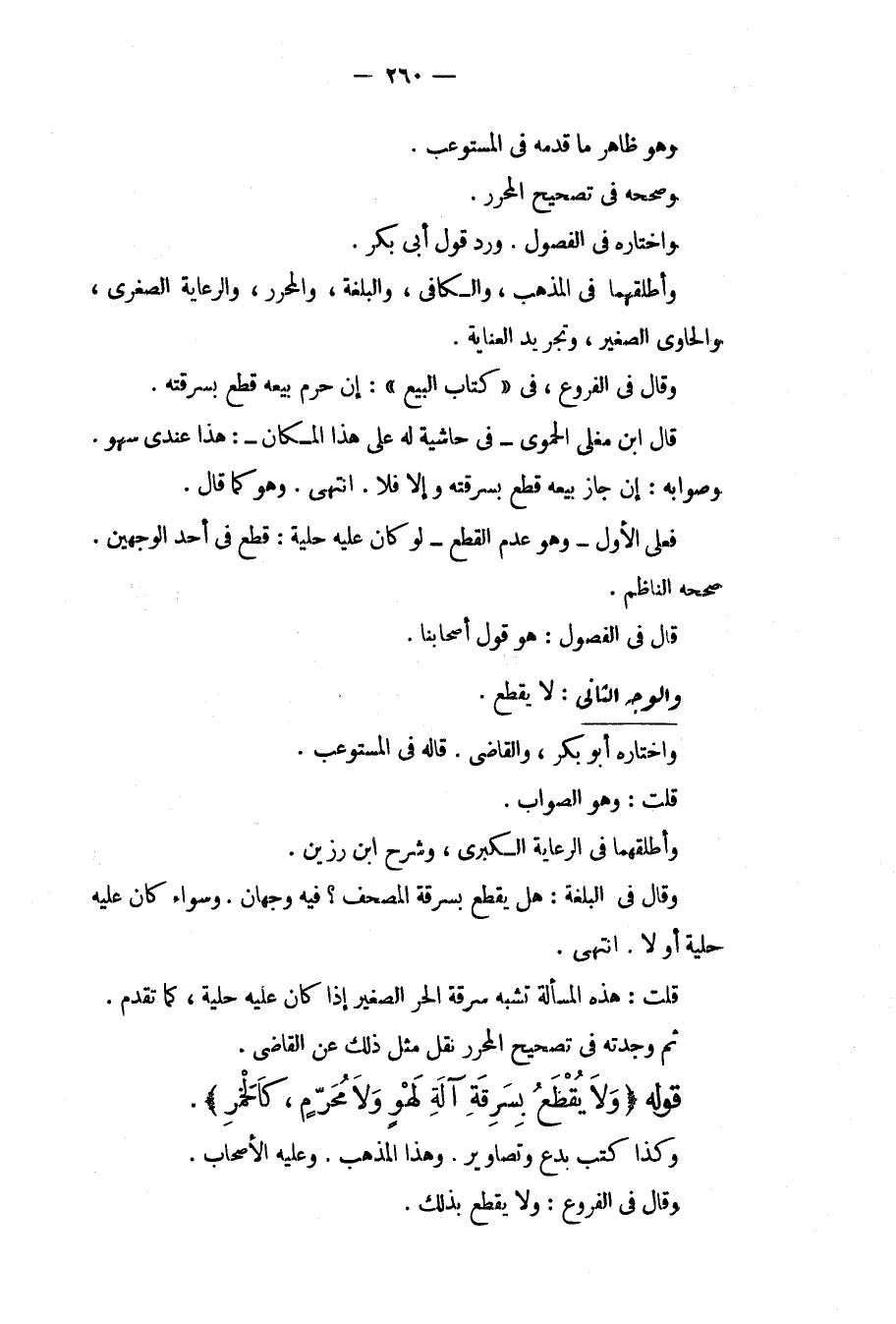 وَالْوَجْهُ الثَّانِي: لَا يُقْطَعُ، وَاخْتَارَهُ أَبُو بَكْرٍ، وَالْقَاضِي. قَالَهُ فِي الْمُسْتَوْعِبِ. قُلْت: وَهُوَ الصَّوَابُ. وَأَطْلَقَهُمَا فِي الرِّعَايَةِ الْكُبْرَى، وَشَرْحِ ابْنِ رَزِينٍ. وَقَالَ فِي الْبُلْغَةِ: هَلْ يُقْطَعُ بِسَرِقَةِ الْمُصْحَفِ؟ فِيهِ وَجْهَانِ. وَسَوَاءٌ كَانَ عَلَيْهِ حِلْيَةٌ أَوْ لَا. انْتَهَى. قُلْت: هَذِهِ الْمَسْأَلَةُ تُشْبِهُ سَرِقَةَ الْحُرِّ الصَّغِيرِ إذَا كَانَ عَلَيْهِ حِلْيَةٌ، كَمَا تَقَدَّمَ. ثُمَّ وَجَدْته فِي تَصْحِيحِ الْمُحَرَّرِ نَقَلَ مِثْلَ ذَلِكَ عَنْ الْقَاضِي.