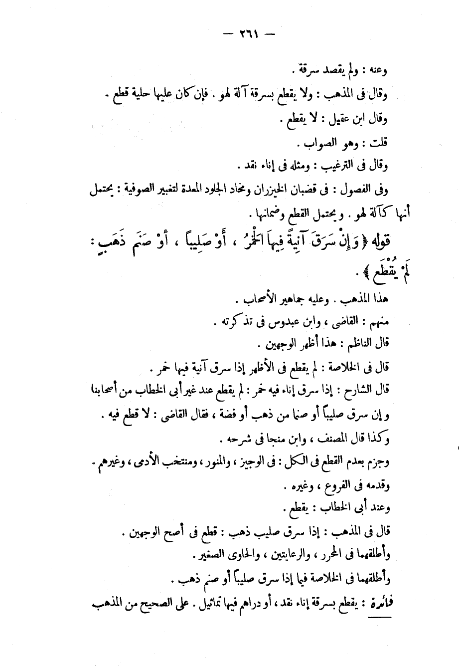 قَوْلُهُ (وَإِنْ سَرَقَ آنِيَةً فِيهَا الْخَمْرُ، أَوْ صَلِيبًا، أَوْ صَنَمَ ذَهَبٍ: لَمْ يُقْطَعْ) . هَذَا الْمَذْهَبُ. وَعَلَيْهِ جَمَاهِيرُ الْأَصْحَابِ. مِنْهُمْ: الْقَاضِي، وَابْنُ عَبْدُوسٍ فِي تَذْكِرَتِهِ. قَالَ النَّاظِمُ: هَذَا أَظْهَرُ الْوَجْهَيْنِ. قَالَ فِي الْخُلَاصَةِ: لَمْ يُقْطَعْ فِي الْأَظْهَرِ إذَا سَرَقَ آنِيَةً فِيهَا خَمْرٌ. قَالَ الشَّارِحُ: إذَا سَرَقَ إنَاءً فِيهِ خَمْرٌ: لَمْ يُقْطَعْ عِنْدَ غَيْرِ أَبِي الْخَطَّابِ مِنْ أَصْحَابِنَا وَإِنْ سَرَقَ صَلِيبًا أَوْ صَنَمًا مِنْ ذَهَبٍ أَوْ فِضَّةٍ، فَقَالَ الْقَاضِي: لَا قَطْعَ فِيهِ. وَكَذَا قَالَ الْمُصَنِّفُ، وَابْنُ مُنَجَّا فِي شَرْحِهِ، وَجَزَمَ بِعَدَمِ الْقَطْعِ فِي الْكُلِّ: فِي الْوَجِيزِ، وَالْمُنَوِّرِ، وَمُنْتَخَبِ الْأَدَمِيِّ، وَغَيْرِهِمْ وَقَدَّمَهُ فِي الْفُرُوعِ، وَغَيْرِهِ. وَعِنْدَ أَبِي الْخَطَّابِ: يُقْطَعُ. قَالَ فِي الْمُذْهَبِ: إذَا سَرَقَ صَلِيبَ ذَهَبٍ: قُطِعَ فِي أَصَحِّ الْوَجْهَيْنِ. وَأَطْلَقَهُمَا فِي الْمُحَرَّرِ، وَالرِّعَايَتَيْنِ، وَالْحَاوِي الصَّغِيرِ: وَأَطْلَقَهُمَا فِي الْخُلَاصَةِ فِيمَا إذَا سَرَقَ صَلِيبًا أَوْ صَنَمَ ذَهَبٍ.