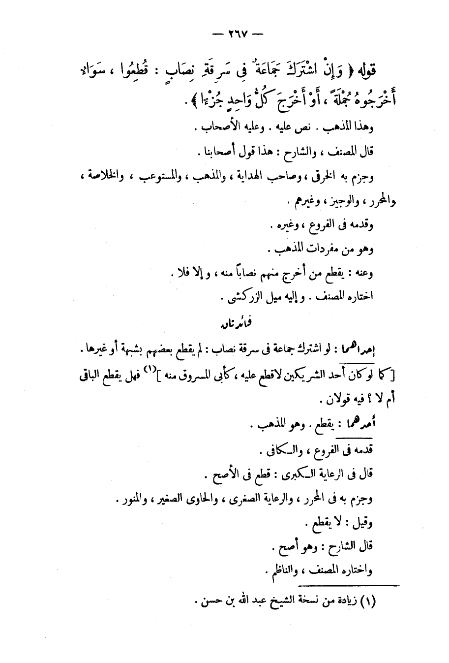 قَوْلُهُ (وَإِنْ اشْتَرَكَ جَمَاعَةٌ فِي سَرِقَةِ نِصَابٍ: قُطِعُوا، سَوَاءٌ أَخْرَجُوهُ جُمْلَةً، أَوْ أَخْرَجَ كُلُّ وَاحِدٍ جُزْءًا) . وَهَذَا الْمَذْهَبُ، نَصَّ عَلَيْهِ. وَعَلَيْهِ الْأَصْحَابُ. قَالَ الْمُصَنِّفُ، وَالشَّارِحُ: هَذَا قَوْلُ أَصْحَابِنَا، وَجَزَمَ بِهِ الْخِرَقِيُّ، وَصَاحِبُ الْهِدَايَةِ، وَالْمُذْهَبِ، وَالْمُسْتَوْعِبِ، وَالْخُلَاصَةِ، وَالْمُحَرَّرِ، وَالْوَجِيزِ، وَغَيْرِهِمْ، وَقَدَّمَهُ فِي الْفُرُوعِ، وَغَيْرِهِ. وَهُوَ مِنْ مُفْرَدَاتِ الْمَذْهَبِ. وَعَنْهُ: يُقْطَعُ مَنْ أَخْرَجَ مِنْهُمْ نِصَابًا مِنْهُ، وَإِلَّا فَلَا، اخْتَارَهُ الْمُصَنِّفُ. وَإِلَيْهِ مَيْلُ الزَّرْكَشِيّ. فَائِدَتَانِ إحْدَاهُمَا: لَوْ اشْتَرَكَ جَمَاعَةٌ فِي سَرِقَةِ نِصَابٍ: لَمْ يُقْطَعْ بَعْضُهُمْ بِشُبْهَةٍ أَوْ غَيْرِهَا. كَمَا لَوْ [كَانَ أَحَدُ الشَّرِيكَيْنِ لَا قَطْعَ عَلَيْهِ، كَأَبِي الْمَسْرُوقِ مِنْهُ] فَهَلْ يُقْطَعُ الْبَاقِي أَمْ لَا؟ فِيهِ قَوْلَانِ.