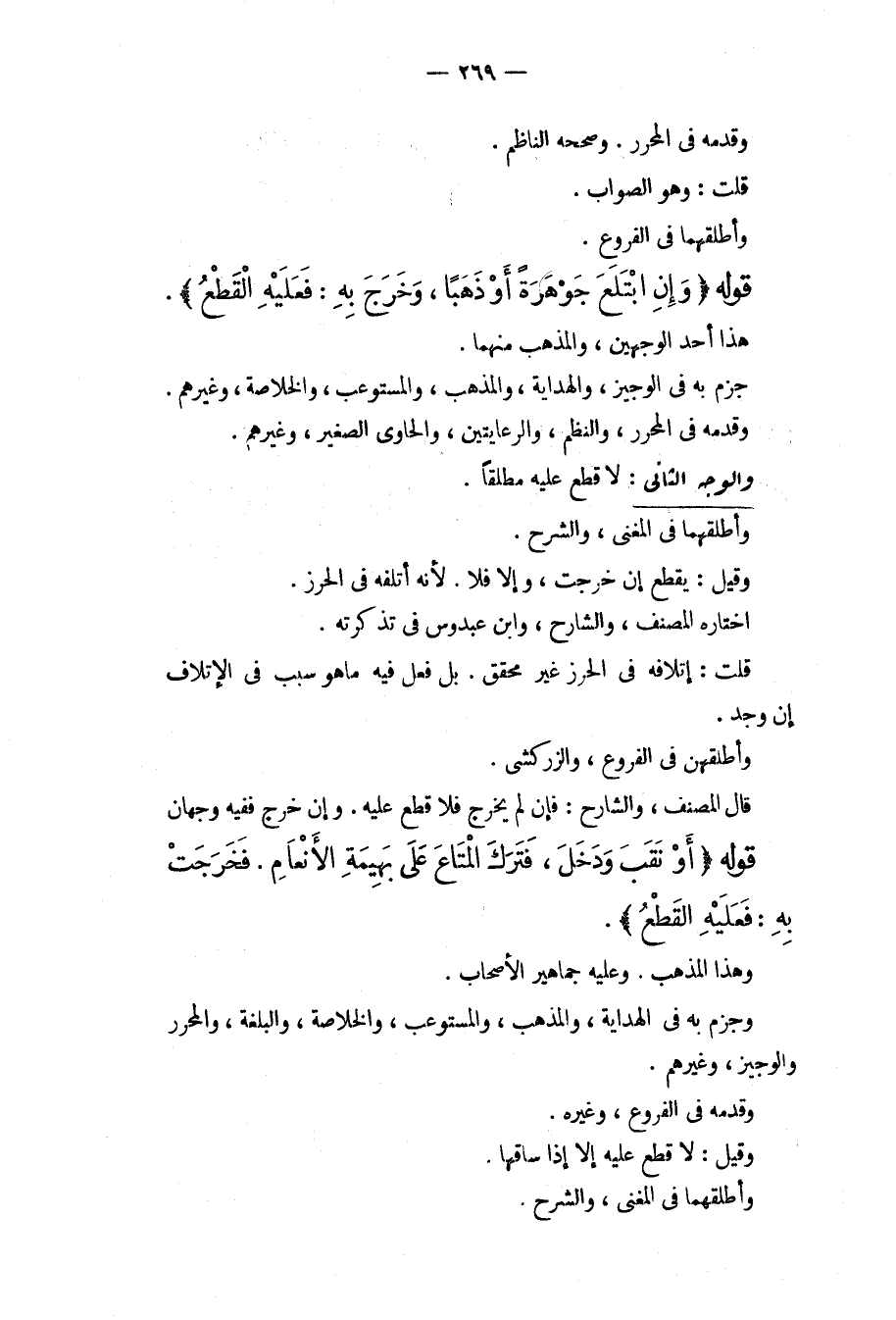 وَالْوَجْهُ الثَّانِي: لَا قَطْعَ عَلَيْهِ مُطْلَقًا. وَأَطْلَقَهُمَا فِي الْمُغْنِي، وَالشَّرْحِ. وَقِيلَ: يُقْطَعُ إنْ خَرَجَتْ، وَإِلَّا فَلَا؛ لِأَنَّهُ أَتْلَفَهُ فِي الْحِرْزِ، اخْتَارَهُ الْمُصَنِّفُ، وَالشَّارِحُ، وَابْنُ عَبْدُوسٍ فِي تَذْكِرَتِهِ. قُلْت: إتْلَافُهُ فِي الْحِرْزِ غَيْرُ مُحَقَّقٍ. بَلْ فَعَلَ فِيهِ مَا هُوَ سَبَبٌ فِي الْإِتْلَافِ إنْ وُجِدَ. وَأَطْلَقَهُنَّ فِي الْفُرُوعِ، وَالزَّرْكَشِيُّ. قَالَ الْمُصَنِّفُ، وَالشَّارِحُ: فَإِنْ لَمْ يَخْرُجْ فَلَا قَطْعَ عَلَيْهِ. وَإِنْ خَرَجَ فَفِيهِ وَجْهَانِ.