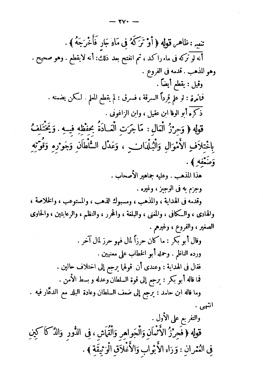 قَوْلُهُ (وَحِرْزُ الْمَالِ: مَا جَرَتْ الْعَادَةُ بِحِفْظِهِ فِيهِ. وَيَخْتَلِفُ بِاخْتِلَافِ الْأَمْوَالِ وَالْبُلْدَانِ، وَعَدْلِ السُّلْطَانِ وَجَوْرِهِ وَقُوَّتِهِ وَضَعْفِهِ) . هَذَا الْمَذْهَبُ. وَعَلَيْهِ جَمَاهِيرُ الْأَصْحَابِ. وَجَزَمَ بِهِ فِي الْوَجِيزِ، وَغَيْرِهِ، وَقَدَّمَهُ فِي الْهِدَايَةِ، وَالْمُذْهَبِ، وَمَسْبُوكِ الذَّهَبِ، وَالْمُسْتَوْعِبِ، وَالْخُلَاصَةِ، وَالْهَادِي، وَالْكَافِي، وَالْمُغْنِي، وَالْبُلْغَةِ، وَالْمُحَرَّرِ، وَالنَّظْمِ، وَالرِّعَايَتَيْنِ، وَالْحَاوِي الصَّغِيرِ، وَالْفُرُوعِ، وَغَيْرِهِمْ. وَقَالَ أَبُو بَكْرٍ: مَا كَانَ حِرْزًا لِمَالٍ فَهُوَ حِرْزٌ لِمَالٍ آخَرَ. وَرَدَّهُ النَّاظِمُ. وَحَمَلَهُ أَبُو الْخَطَّابِ عَلَى مَعْنَيَيْنِ. فَقَالَ فِي الْهِدَايَةِ: وَعِنْدِي أَنَّ قَوْلَهُمَا يَرْجِعُ إلَى اخْتِلَافِ حَالَيْنِ. فَمَا قَالَهُ أَبُو بَكْرٍ: يَرْجِعُ إلَى قُوَّةِ السُّلْطَانِ وَعَدْلِهِ وَبَسْطِ الْأَمْنِ. وَمَا قَالَهُ ابْنُ حَامِدٍ: يَرْجِعُ إلَى ضَعْفِ السُّلْطَانِ وَعَادَةِ الْبَلَدِ مَعَ الدُّعَّارِ فِيهِ. انْتَهَى. وَالتَّفْرِيعُ عَلَى الْأَوَّلِ.