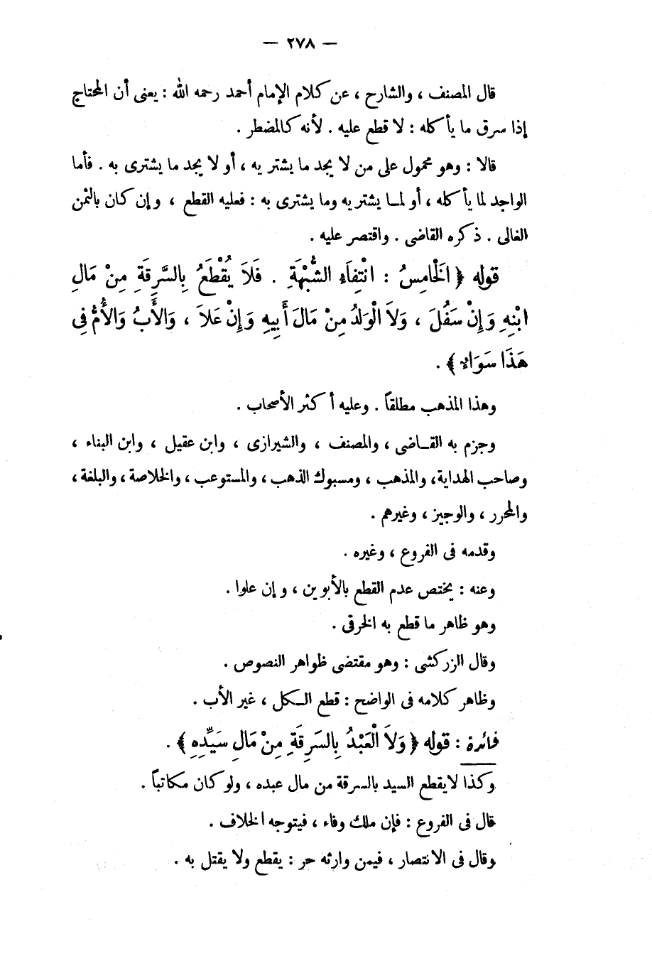 قَوْلُهُ (الْخَامِسُ: انْتِفَاءُ الشُّبْهَةِ. فَلَا يُقْطَعُ بِالسَّرِقَةِ مِنْ مَالِ ابْنِهِ وَإِنْ سَفَلَ، وَلَا الْوَلَدُ مِنْ مَالِ أَبِيهِ وَإِنْ عَلَا، وَالْأَبُ وَالْأُمُّ فِي هَذَا سَوَاءٌ) . وَهَذَا الْمَذْهَبُ مُطْلَقًا. وَعَلَيْهِ أَكْثَرُ الْأَصْحَابِ، وَجَزَمَ بِهِ الْقَاضِي، وَالْمُصَنِّفُ، وَالشِّيرَازِيُّ، وَابْنُ عَقِيلٍ، وَابْنُ الْبَنَّاءِ، وَصَاحِبُ الْهِدَايَةِ، وَالْمُذْهَبِ، وَمَسْبُوكِ الذَّهَبِ، وَالْمُسْتَوْعِبِ، وَالْخُلَاصَةِ، وَالْبُلْغَةِ، وَالْمُحَرَّرِ، وَالْوَجِيزِ، وَغَيْرُهُمْ، وَقَدَّمَهُ فِي الْفُرُوعِ، وَغَيْرِهِ. وَعَنْهُ: يَخْتَصُّ عَدَمُ الْقَطْعِ بِالْأَبَوَيْنِ، وَإِنْ عَلَوْا. وَهُوَ ظَاهِرُ مَا قَطَعَ بِهِ الْخِرَقِيُّ. وَقَالَ الزَّرْكَشِيُّ: وَهُوَ مُقْتَضَى ظَوَاهِرِ النُّصُوصِ. وَظَاهِرُ كَلَامِهِ فِي الْوَاضِحِ: قَطْعُ الْكُلِّ، غَيْرَ الْأَبِ.