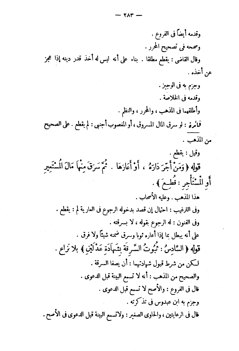 وَقَدَّمَهُ أَيْضًا فِي الْفُرُوعِ، وَصَحَّحَهُ فِي تَصْحِيحِ الْمُحَرَّرِ. وَقَالَ الْقَاضِي: يُقْطَعُ مُطْلَقًا. بِنَاءً عَلَى أَنَّهُ لَيْسَ لَهُ أَخْذُ قَدْرِ دَيْنِهِ إذَا عَجَزَ عَنْ أَخْذِهِ، وَجَزَمَ بِهِ فِي الْوَجِيزِ، وَقَدَّمَهُ فِي الْخُلَاصَةِ. وَأَطْلَقَهُمَا فِي الْمُذْهَبِ، وَالْمُحَرَّرِ، وَالنَّظْمِ.