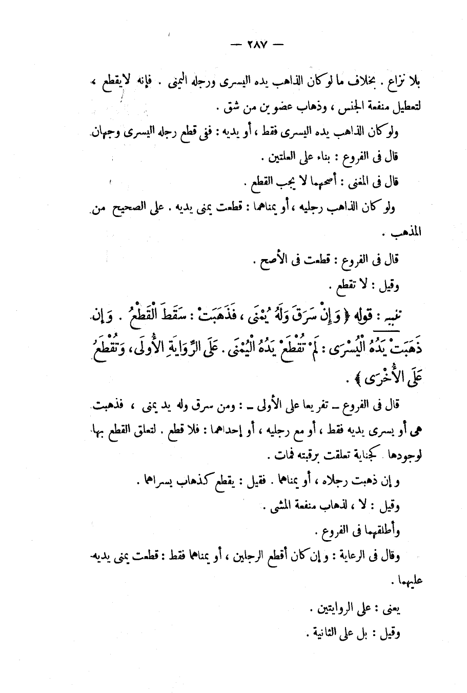 تَنْبِيهٌ: قَوْلُهُ (وَإِنْ سَرَقَ وَلَهُ يُمْنَى، فَذَهَبَتْ: سَقَطَ الْقَطْعُ. وَإِنْ ذَهَبَتْ يَدُهُ الْيُسْرَى: لَمْ تُقْطَعْ يَدُهُ الْيُمْنَى عَلَى الرِّوَايَةِ الْأُولَى، وَتُقْطَعُ عَلَى الْأُخْرَى) . قَالَ فِي الْفُرُوعِ تَفْرِيعًا عَلَى الْأُولَى: وَمَنْ سَرَقَ وَلَهُ يَدٌ يُمْنَى، فَذَهَبَتْ هِيَ أَوْ يُسْرَى يَدَيْهِ فَقَطْ، أَوْ مَعَ رِجْلَيْهِ، أَوْ إحْدَاهُمَا: فَلَا قَطْعَ؛ لِتَعَلُّقِ الْقَطْعِ بِهَا لِوُجُودِهَا. كَجِنَايَةٍ تَعَلَّقَتْ بِرَقَبَتِهِ فَمَاتَ. وَإِنْ ذَهَبَتْ رِجْلَاهُ، أَوْ يُمْنَاهُمَا. فَقِيلَ: يُقْطَعُ كَذَهَابِ يُسْرَاهُمَا. وَقِيلَ: لَا لِذَهَابِ مَنْفَعَةِ الْمَشْيِ. وَأَطْلَقَهُمَا فِي الْفُرُوعِ. وَقَالَ فِي الرِّعَايَةِ: وَإِنْ كَانَ أَقْطَعَ الرِّجْلَيْنِ، أَوْ يُمْنَاهُمَا فَقَطْ: قُطِعَتْ يُمْنَى يَدَيْهِ عَلَيْهِمَا. يَعْنِي عَلَى الرِّوَايَتَيْنِ. وَقِيلَ: بَلْ عَلَى الثَّانِيَةِ.