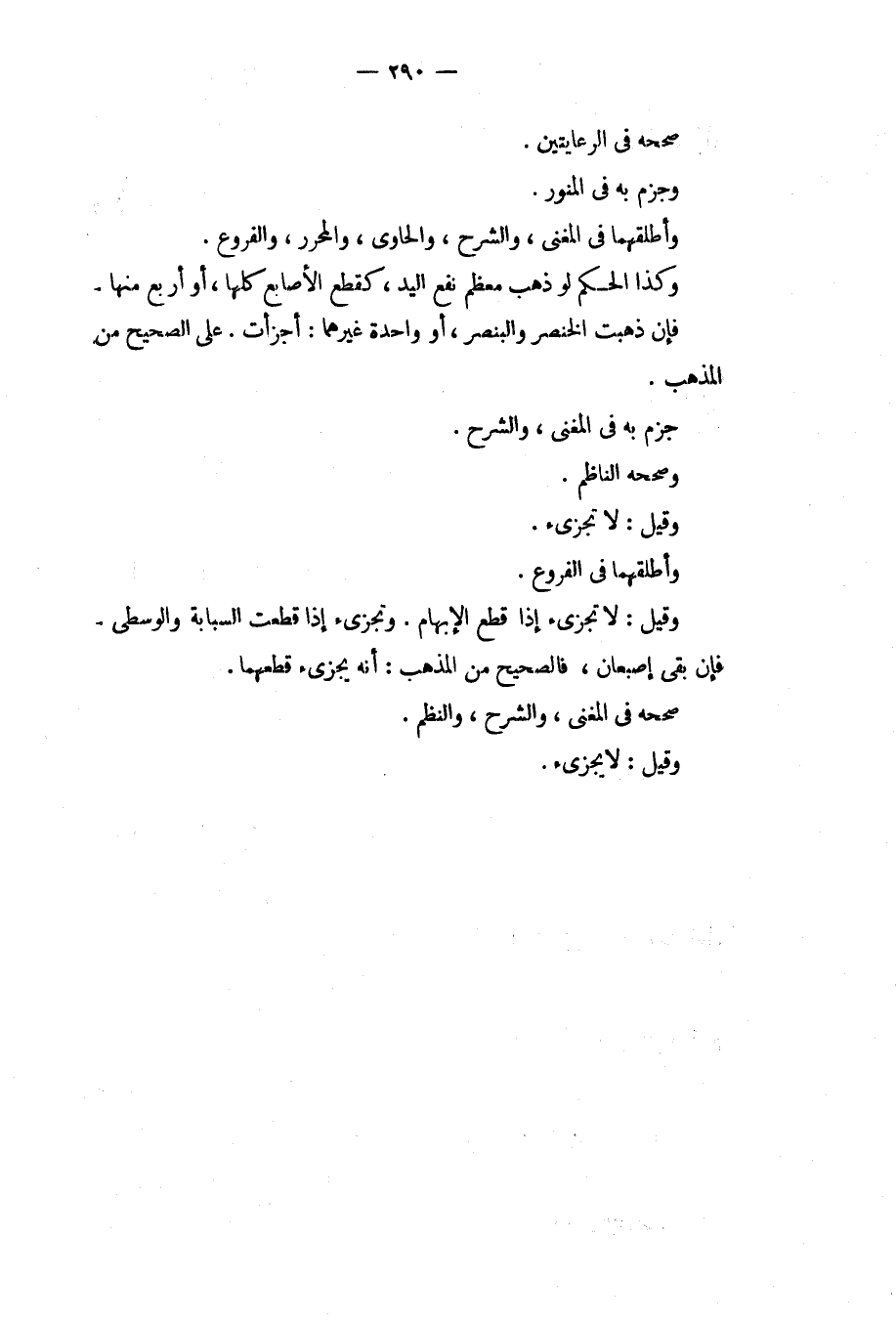 صَحَّحَهُ فِي الرِّعَايَتَيْنِ، وَجَزَمَ بِهِ فِي الْمُنَوِّرِ. وَأَطْلَقَهُمَا فِي الْمُغْنِي، وَالشَّرْحِ، وَالْحَاوِي، وَالْمُحَرَّرِ، وَالْفُرُوعِ. وَكَذَا الْحُكْمُ لَوْ ذَهَبَ مُعْظَمُ نَفْعِ الْيَدِ كَقَطْعِ الْأَصَابِعِ كُلِّهَا، أَوْ أَرْبَعٍ مِنْهَا. فَإِنْ ذَهَبَتْ الْخِنْصَرُ وَالْبِنْصِرُ، أَوْ وَاحِدَةٌ غَيْرُهُمَا: أَجْزَأَتْ عَلَى الصَّحِيحِ مِنْ الْمَذْهَبِ، جَزَمَ بِهِ فِي الْمُغْنِي، وَالشَّرْحِ، وَصَحَّحَهُ النَّاظِمُ. وَقِيلَ: لَا تُجْزِئُ. وَأَطْلَقَهُمَا فِي الْفُرُوعِ. وَقِيلَ: لَا تُجْزِئُ إذَا قُطِعَ الْإِبْهَامُ. وَتُجْزِئُ إذَا قُطِعَتْ السَّبَّابَةُ وَالْوُسْطَى فَإِنْ بَقِيَ إصْبَعَانِ، فَالصَّحِيحُ مِنْ الْمَذْهَبِ: أَنَّهُ يُجْزِئُ قَطْعُهُمَا، صَحَّحَهُ فِي الْمُغْنِي، وَالشَّرْحِ، وَالنَّظْمِ. وَقِيلَ: لَا يُجْزِئُ.