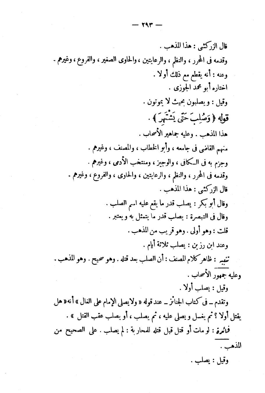 قَالَ الزَّرْكَشِيُّ: هَذَا الْمَذْهَبُ، وَقَدَّمَهُ فِي الْمُحَرَّرِ، وَالنَّظْمِ، وَالرِّعَايَتَيْنِ، وَالْحَاوِي الصَّغِيرِ، وَالْفُرُوعِ، وَغَيْرِهِمْ. وَعَنْهُ: أَنَّهُ يُقْطَعُ مَعَ ذَلِكَ أَوَّلًا، اخْتَارَهُ أَبُو مُحَمَّدٍ الْجَوْزِيُّ. وَقِيلَ: وَيُصْلَبُونَ بِحَيْثُ لَا يَمُوتُونَ. قَوْلُهُ (وَصُلِبَ حَتَّى يَشْتَهِرَ) . هَذَا الْمَذْهَبُ. وَعَلَيْهِ جَمَاهِيرُ الْأَصْحَابِ. مِنْهُمْ الْقَاضِي فِي جَامِعِهِ، وَأَبُو الْخَطَّابِ، وَالْمُصَنِّفُ، وَغَيْرُهُمْ، وَجَزَمَ بِهِ فِي الْكَافِي، وَالْوَجِيزِ، وَمُنْتَخَبِ الْأَدَمِيِّ، وَغَيْرِهِمْ، وَقَدَّمَهُ فِي الْمُحَرَّرِ، وَالنَّظْمِ، وَالرِّعَايَتَيْنِ، وَالْحَاوِي، وَالْفُرُوعِ، وَغَيْرِهِمْ. قَالَ الزَّرْكَشِيُّ: هَذَا الْمَذْهَبُ. وَقَالَ أَبُو بَكْرٍ: يُصْلَبُ قَدْرَ مَا يَقَعُ عَلَيْهِ اسْمُ الصَّلْبِ. وَقَالَ فِي التَّبْصِرَةِ: يُصْلَبُ قَدْرَ مَا يُتَمَثَّلُ بِهِ وَيُعْتَبَرُ. قُلْت: وَهُوَ أَوْلَى. وَهُوَ قَرِيبٌ مِنْ الْمَذْهَبِ. وَعِنْدَ ابْنِ رَزِينٍ: يُصْلَبُ ثَلَاثَةَ أَيَّامٍ.