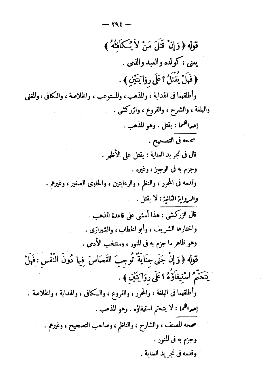 قَوْلُهُ (وَإِنْ قَتَلَ مَنْ لَا يُكَافِئُهُ) يَعْنِي: كَوَلَدِهِ وَالْعَبْدِ وَالذِّمِّيِّ. (فَهَلْ يُقْتَلُ؟ عَلَى رِوَايَتَيْنِ) . وَأَطْلَقَهُمَا فِي الْهِدَايَةِ، وَالْمُذْهَبِ، وَالْمُسْتَوْعِبِ، وَالْخُلَاصَةِ، وَالْكَافِي، وَالْمُغْنِي وَالْبُلْغَةِ، وَالشَّرْحِ، وَالْفُرُوعِ، وَالزَّرْكَشِيُّ إحْدَاهُمَا: يُقْتَلُ وَهُوَ الْمَذْهَبُ. صَحَّحَهُ فِي التَّصْحِيحِ. قَالَ فِي تَجْرِيدِ الْعِنَايَةِ: يُقْتَلُ عَلَى الْأَظْهَرِ، وَجَزَمَ بِهِ فِي الْوَجِيزِ، وَغَيْرِهِ. وَقَدَّمَهُ فِي الْمُحَرَّرِ، وَالنَّظْمِ، وَالرِّعَايَتَيْنِ، وَالْحَاوِي الصَّغِيرِ، وَغَيْرِهِمْ.
