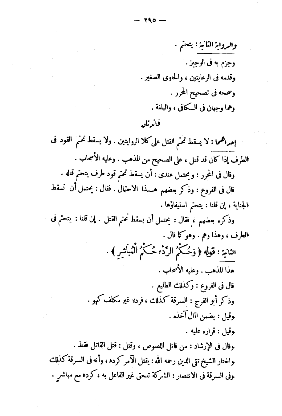 الثَّانِيَةُ: قَوْلُهُ (وَحُكْمُ الرِّدْءِ حُكْمُ الْمُبَاشِرِ) . هَذَا الْمَذْهَبُ. وَعَلَيْهِ الْأَصْحَابُ. قَالَ فِي الْفُرُوعِ: وَكَذَلِكَ الطَّلِيعُ. وَذَكَرَ أَبُو الْفَرَجِ: السَّرِقَةُ كَذَلِكَ، فَرِدْءٌ غَيْرُ مُكَلَّفٍ كَهُوَ. وَقِيلَ: يَضْمَنُ الْمَالَ آخِذُهُ. وَقِيلَ: قَرَارُهُ عَلَيْهِ. وَقَالَ فِي الْإِرْشَادِ: مَنْ قَاتَلَ اللُّصُوصَ، وَقُتِلَ: قُتِلَ الْقَاتِلُ فَقَطْ، وَاخْتَارَ الشَّيْخُ تَقِيُّ الدِّينِ - رَحِمَهُ اللَّهُ -: يُقْتَلُ الْآمِرُ كَرِدْءٍ، وَأَنَّهُ فِي السَّرِقَةِ كَذَلِكَ وَفِي السَّرِقَةِ فِي الِانْتِصَارِ: الشَّرِكَةُ تُلْحِقُ غَيْرَ الْفَاعِلِ بِهِ، كَرِدْءٍ مَعَ مُبَاشِرٍ.