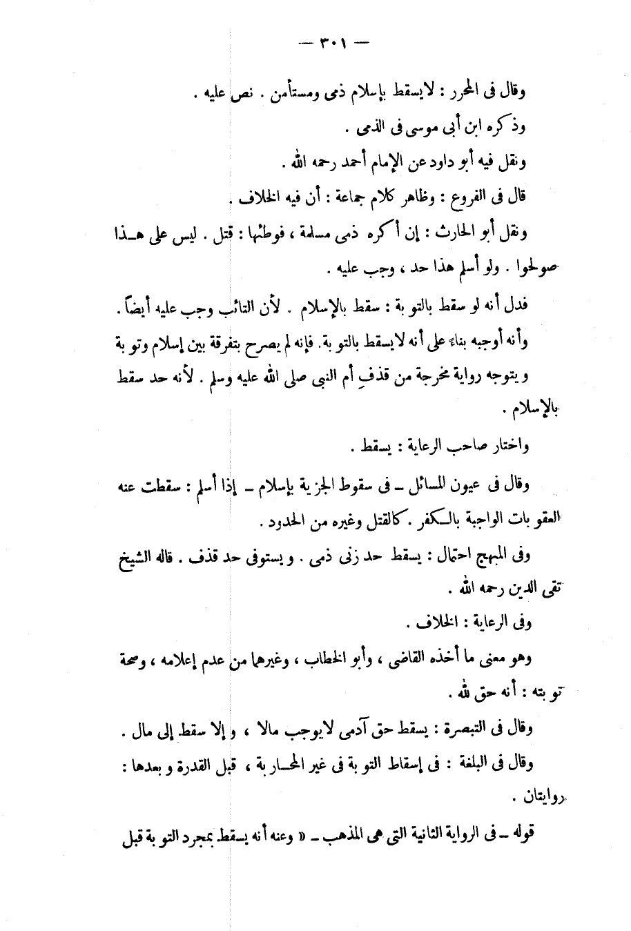 وَقَالَ فِي الْمُحَرَّرِ: لَا يَسْقُطُ بِإِسْلَامِ ذِمِّيٍّ وَمُسْتَأْمِنٍ، نَصَّ عَلَيْهِ. وَذَكَرَهُ ابْنُ أَبِي مُوسَى فِي الذِّمِّيِّ. وَنَقَلَ فِيهِ أَبُو دَاوُد عَنْ الْإِمَامِ أَحْمَد - رَحِمَهُ اللَّهُ -. قَالَ فِي الْفُرُوعِ: وَظَاهِرُ كَلَامِ جَمَاعَةٍ: أَنَّ فِيهِ الْخِلَافَ. وَنَقَلَ أَبُو الْحَارِثِ: إنْ أَكْرَهَ ذِمِّيٌّ مُسْلِمَةً، فَوَطِئَهَا: قُتِلَ. لَيْسَ عَلَى هَذَا صُولِحُوا. وَلَوْ أَسْلَمَ هَذَا حُدَّ، وَجَبَ عَلَيْهِ. فَدَلَّ أَنَّهُ لَوْ سَقَطَ بِالتَّوْبَةِ: سَقَطَ بِالْإِسْلَامِ؛ لِأَنَّ التَّائِبَ وَجَبَ عَلَيْهِ أَيْضًا. وَأَنَّهُ أَوْجَبَهُ بِنَاءً عَلَى أَنَّهُ لَا يَسْقُطُ بِالتَّوْبَةِ. فَإِنَّهُ لَمْ يُصَرِّحْ بِتَفْرِقَةٍ بَيْنَ إسْلَامٍ وَتَوْبَةٍ وَيُتَوَجَّهُ رِوَايَةً مُخَرَّجَةً مَنْ قَذَفَ أُمَّ النَّبِيِّ - صَلَّى اللَّهُ عَلَيْهِ وَسَلَّمَ -؛ لِأَنَّهُ حَدٌّ سَقَطَ بِالْإِسْلَامِ، وَاخْتَارَ صَاحِبُ الرِّعَايَةِ: يَسْقُطُ. وَقَالَ فِي عُيُونِ الْمَسَائِلِ فِي سُقُوطِ الْجِزْيَةِ بِإِسْلَامٍ إذَا أَسْلَمَ: سَقَطَتْ عَنْهُ الْعُقُوبَاتُ الْوَاجِبَةُ بِالْكُفْرِ. كَالْقَتْلِ وَغَيْرِهِ مِنْ الْحُدُودِ. وَفِي الْمُبْهِجِ احْتِمَالٌ: يُسْقَطُ حَدُّ زِنَا ذِمِّيٍّ. وَيُسْتَوْفَى حَدُّ قَذْفٍ. قَالَهُ الشَّيْخُ تَقِيُّ الدِّينِ - رَحِمَهُ اللَّهُ -.