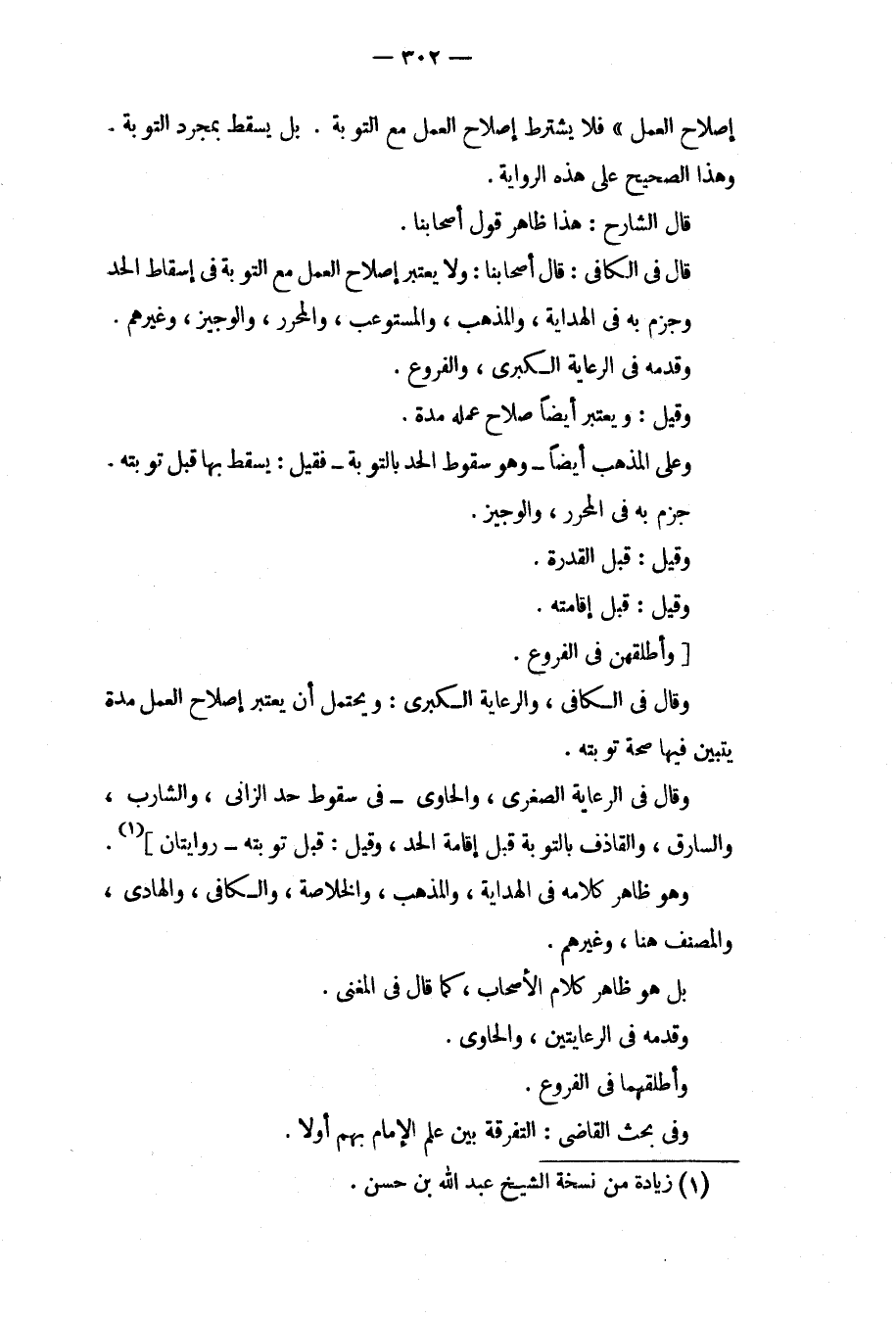 إصْلَاحِ الْعَمَلِ " فَلَا يُشْتَرَطُ إصْلَاحُ الْعَمَلِ مَعَ التَّوْبَةِ. بَلْ يَسْقُطُ بِمُجَرَّدِ التَّوْبَةِ. وَهَذَا الصَّحِيحُ عَلَى هَذِهِ الرِّوَايَةِ. قَالَ الشَّارِحُ: هَذَا ظَاهِرُ قَوْلِ أَصْحَابِنَا. قَالَ فِي الْكَافِي: قَالَ أَصْحَابُنَا: وَلَا يُعْتَبَرُ إصْلَاحُ الْعَمَلِ مَعَ التَّوْبَةِ فِي إسْقَاطِ الْحَدِّ وَجَزَمَ بِهِ فِي الْهِدَايَةِ، وَالْمُذْهَبِ، وَالْمُسْتَوْعِبِ، وَالْمُحَرَّرِ، وَالْوَجِيزِ، وَغَيْرِهِمْ، وَقَدَّمَهُ فِي الرِّعَايَةِ الْكُبْرَى، وَالْفُرُوعِ. وَقِيلَ: وَيُعْتَبَرُ أَيْضًا صَلَاحُ عَمَلِهِ مُدَّةً. وَعَلَى الْمَذْهَبِ أَيْضًا وَهُوَ سُقُوطُ الْحَدِّ بِالتَّوْبَةِ فَقِيلَ: يَسْقُطُ بِهَا قَبْلَ تَوْبَتِهِ، جَزَمَ بِهِ فِي الْمُحَرَّرِ، وَالْوَجِيزِ.