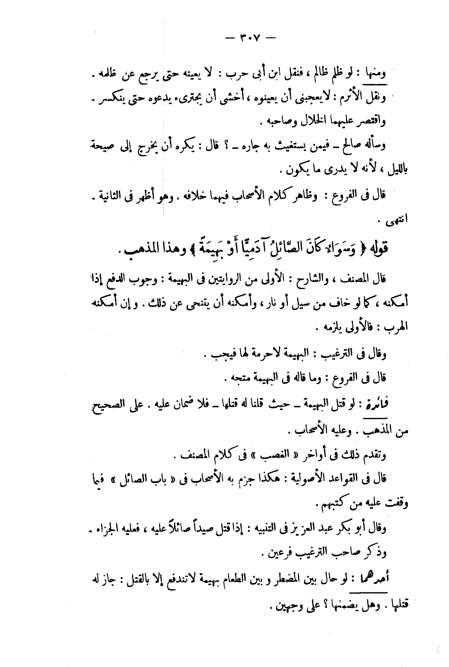 قَوْلُهُ (وَسَوَاءٌ كَانَ الصَّائِلُ آدَمِيًّا أَوْ بَهِيمَةً) وَهَذَا الْمَذْهَبُ. قَالَ الْمُصَنِّفُ وَالشَّارِحُ: الْأَوْلَى مِنْ الرِّوَايَتَيْنِ فِي الْبَهِيمَةِ: وُجُوبُ الدَّفْعِ إذَا أَمْكَنَهُ، كَمَا لَوْ خَافَ مِنْ سَيْلٍ أَوْ نَارٍ، وَأَمْكَنَهُ أَنْ يَتَنَحَّى عَنْ ذَلِكَ. وَإِنْ أَمْكَنَهُ الْهَرَبُ: فَالْأَوْلَى يَلْزَمُهُ. وَقَالَ فِي التَّرْغِيبِ: الْبَهِيمَةُ لَا حُرْمَةَ لَهَا فَيَجِبُ. قَالَ فِي الْفُرُوعِ: وَمَا قَالَهُ فِي الْبَهِيمَةِ مُتَّجَهٌ.