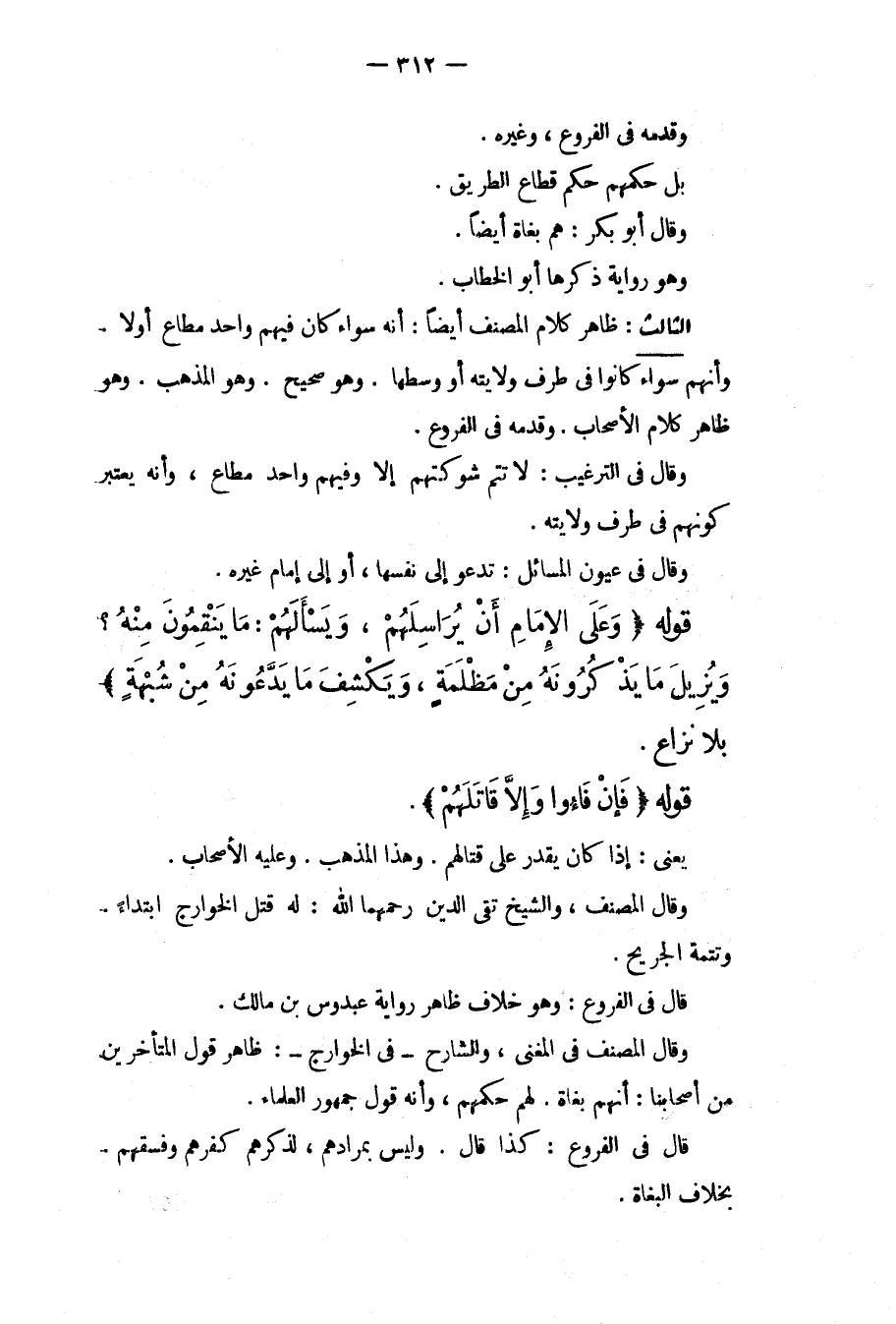 قَوْلُهُ (وَعَلَى الْإِمَامِ أَنْ يُرَاسَلَهُمْ، وَيَسْأَلَهُمْ: مَا يَنْقِمُونَ مِنْهُ؟ وَيُزِيلَ مَا يَذْكُرُونَهُ مِنْ مَظْلِمَةٍ، وَيَكْشِفَ مَا يَدَّعُونَهُ مِنْ شُبْهَةٍ) بِلَا نِزَاعٍ. قَوْلُهُ (فَإِنْ فَاءُوا وَإِلَّا قَاتَلَهُمْ) . يَعْنِي: إذَا كَانَ يَقْدِرُ عَلَى قِتَالِهِمْ. وَهَذَا الْمَذْهَبُ. وَعَلَيْهِ الْأَصْحَابُ. وَقَالَ الْمُصَنِّفُ وَالشَّيْخُ تَقِيُّ الدِّينِ رَحِمَهُمَا اللَّهُ: لَهُ قَتْلُ الْخَوَارِجِ ابْتِدَاءً. وَتَتِمَّةً الْجَرِيحِ. قَالَ فِي الْفُرُوعِ: وَهُوَ خِلَافُ ظَاهِرِ رِوَايَةِ عَبْدُوسِ بْنِ مَالِكٍ. وَقَالَ الْمُصَنِّفُ فِي الْمُغْنِي، وَالشَّارِحُ فِي الْخَوَارِجِ: ظَاهِرُ قَوْلِ الْمُتَأَخِّرِينَ مِنْ أَصْحَابِنَا: أَنَّهُمْ بُغَاةٌ. لَهُمْ حُكْمُهُمْ، وَأَنَّهُ قَوْلُ جُمْهُورِ الْعُلَمَاءِ. قَالَ فِي الْفُرُوعِ: كَذَا قَالَ. وَلَيْسَ بِمُرَادِهِمْ، لِذِكْرِهِمْ كُفْرَهُمْ وَفِسْقَهُمْ. بِخِلَافِ الْبُغَاةِ.