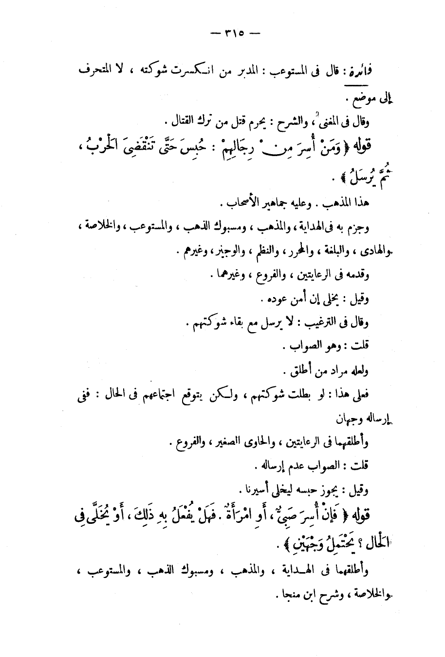 قَوْلُهُ (وَمَنْ أُسِرَ مِنْ رِجَالِهِمْ: حُبِسَ حَتَّى تَنْقَضِيَ الْحَرْبُ، ثُمَّ يُرْسَلَ) . هَذَا الْمَذْهَبُ. وَعَلَيْهِ جَمَاهِيرُ الْأَصْحَابِ، وَجَزَمَ بِهِ فِي الْهِدَايَةِ، وَالْمُذْهَبِ، وَمَسْبُوكِ الذَّهَبِ، وَالْمُسْتَوْعِبِ، وَالْخُلَاصَةِ، وَالْهَادِي، وَالْبُلْغَةِ، وَالْمُحَرَّرِ، وَالنَّظْمِ، وَالْوَجِيزِ، وَغَيْرِهِمْ. وَقَدَّمَهُ فِي الرِّعَايَتَيْنِ، وَالْفُرُوعِ، وَغَيْرِهِمَا. وَقِيلَ: يُخَلَّى إنْ أُمِنَ عَوْدُهُ. وَقَالَ فِي التَّرْغِيبِ: لَا يُرْسَلُ مَعَ بَقَاءِ شَوْكَتِهِمْ. قُلْت: وَهُوَ الصَّوَابُ. وَلَعَلَّهُ مُرَادُ مَنْ أَطْلَقَ. فَعَلَى هَذَا: لَوْ بَطَلَتْ شَوْكَتُهُمْ، وَلَكِنْ يُتَوَقَّعُ اجْتِمَاعُهُمْ فِي الْحَالِ: فَفِي إرْسَالِهِ وَجْهَانِ وَأَطْلَقَهُمَا فِي الرِّعَايَتَيْنِ، وَالْحَاوِي الصَّغِيرِ، وَالْفُرُوعِ. قُلْت: الصَّوَابُ عَدَمُ إرْسَالِهِ. وَقِيلَ: يَجُوزُ حَبْسُهُ لِيُخَلَّى أَسِيرُنَا.