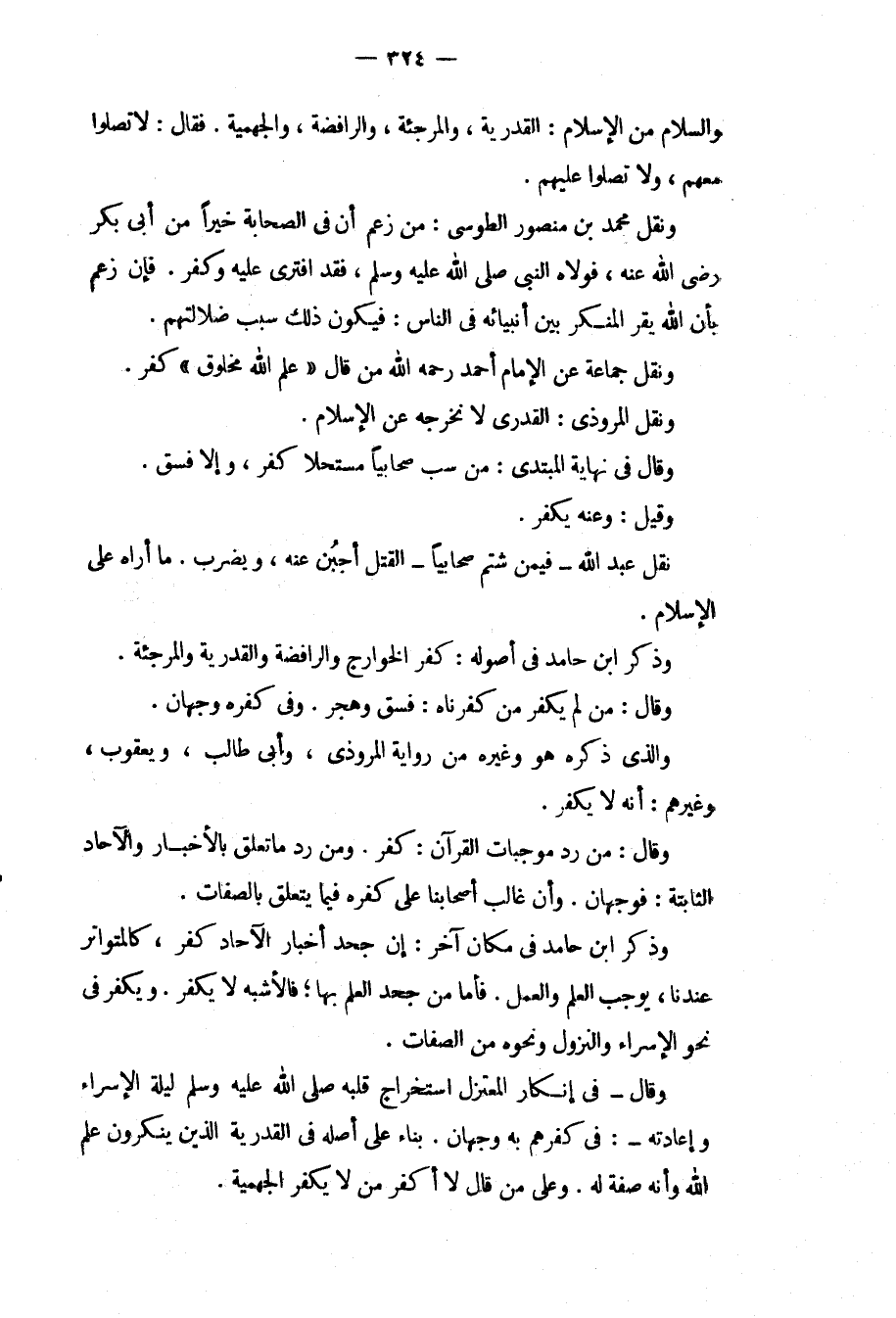 مِنْ الْإِسْلَامِ: الْقَدَرِيَّةُ، وَالْمُرْجِئَةُ، وَالرَّافِضَةُ، وَالْجَهْمِيَّةُ. فَقَالَ: لَا تُصَلُّوا مَعَهُمْ، وَلَا تُصَلُّوا عَلَيْهِمْ. وَنَقَلَ مُحَمَّدُ بْنُ مَنْصُورِ الطُّوسِيُّ: مَنْ زَعَمَ أَنَّ فِي الصَّحَابَةِ خَيْرًا مِنْ أَبِي بَكْرٍ - رَضِيَ اللَّهُ عَنْهُ -، فَوَلَّاهُ النَّبِيُّ - صَلَّى اللَّهُ عَلَيْهِ وَسَلَّمَ -، فَقَدْ افْتَرَى عَلَيْهِ وَكَفَرَ. فَإِنْ زَعَمَ بِأَنَّ اللَّهَ قَرَّ الْمُنْكَرَ بَيْنَ أَنْبِيَائِهِ فِي النَّاسِ: فَيَكُونُ ذَلِكَ سَبَبَ ضَلَالَتِهِمْ. وَنَقَلَ جَمَاعَةٌ عَنْ الْإِمَامِ أَحْمَدَ - رَحِمَهُ اللَّهُ - مَنْ قَالَ " عِلْمُ اللَّهِ مَخْلُوقٌ " كَفَرَ. وَنَقَلَ الْمَرُّوذِيُّ: الْقَدَرِيُّ لَا نُخْرِجُهُ عَنْ الْإِسْلَامِ. وَقَالَ فِي نِهَايَةِ الْمُبْتَدِئِ: مَنْ سَبَّ صَحَابِيًّا مُسْتَحِلًّا كَفَرَ، وَإِلَّا فَسَقَ. وَقِيلَ: وَعَنْهُ يَكْفُرُ. نَقَلَ عَبْدُ اللَّهِ فِيمَنْ شَتَمَ صَحَابِيًّا الْقَتْلَ أَجْبُنُ عَنْهُ، وَيُضْرَبُ. مَا أَرَاهُ عَلَى الْإِسْلَامِ. وَذَكَرَ ابْنُ حَامِدٍ فِي أُصُولِهِ: كُفْرَ الْخَوَارِجِ وَالرَّافِضَةِ وَالْقَدَرِيَّةِ وَالْمُرْجِئَةِ.