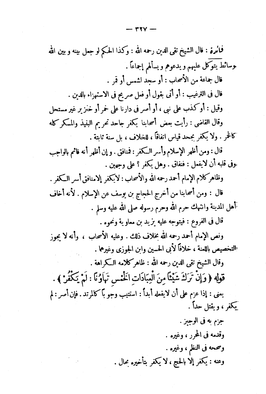فَائِدَةٌ: قَالَ الشَّيْخُ تَقِيُّ الدِّينِ - رَحِمَهُ اللَّهُ -: وَكَذَا الْحُكْمُ لَوْ جَعَلَ بَيْنَهُ وَبَيْنَ اللَّهِ وَسَائِطَ يَتَوَكَّلُ عَلَيْهِمْ وَيَدْعُوهُمْ وَيَسْأَلُهُمْ إجْمَاعًا. قَالَ جَمَاعَةٌ مِنْ الْأَصْحَابِ: أَوْ سَجَدَ لِشَمْسٍ أَوْ قَمَرٍ. قَالَ فِي التَّرْغِيبِ: أَوْ أَتَى بِقَوْلٍ أَوْ فِعْلٍ صَرِيحٍ فِي الِاسْتِهْزَاءِ بِالدِّينِ. وَقِيلَ: أَوْ كَذَبَ عَلَى نَبِيٍّ، أَوْ أَصَرَّ فِي دَارِنَا عَلَى خَمْرٍ أَوْ خِنْزِيرٍ غَيْرَ مُسْتَحِلٍّ وَقَالَ الْقَاضِي: رَأَيْت بَعْضَ أَصْحَابِنَا يُكَفِّرُ جَاحِدَ تَحْرِيمِ النَّبِيذِ وَالْمُسْكِرِ كُلِّهِ كَالْخَمْرِ. وَلَا يَكْفُرُ بِجَحْدِ قِيَاسٍ اتِّفَاقًا، لِلْخِلَافِ، بَلْ سُنَّةٌ ثَابِتَةٌ. قَالَ: وَمَنْ أَظْهَرَ الْإِسْلَامَ وَأَسَرَّ الْكُفْرَ: فَمُنَافِقٌ. وَإِنْ أَظْهَرَ أَنَّهُ قَائِمٌ بِالْوَاجِبِ وَفِي قَلْبِهِ أَنْ لَا يَفْعَلَ: فَنِفَاقٌ. وَهَلْ يَكْفُرُ؟ عَلَى وَجْهَيْنِ، وَظَاهِرُ كَلَامِ الْإِمَامِ أَحْمَدَ - رَحِمَهُ اللَّهُ - وَالْأَصْحَابِ: لَا يَكْفُرُ إلَّا مُنَافِقٌ أَسَرَّ الْكُفْرَ. قَالَ: وَمِنْ أَصْحَابِنَا مَنْ أَخْرَجَ الْحَجَّاجَ بْنَ يُوسُفَ عَنْ الْإِسْلَامِ؛ لِأَنَّهُ أَخَافَ أَهْلَ الْمَدِينَةِ وَانْتَهَكَ حُرَمَ اللَّهِ وَحُرَمَ رَسُولِهِ - صَلَّى اللَّهُ عَلَيْهِ وَسَلَّمَ -. قَالَ فِي الْفُرُوعِ: فَيَتَوَجَّهُ عَلَيْهِ يَزِيدُ بْنُ مُعَاوِيَةَ وَنَحْوُهُ، وَنَصُّ الْإِمَامِ أَحْمَدَ - رَحِمَهُ اللَّهُ - بِخِلَافِ ذَلِكَ. وَعَلَيْهِ الْأَصْحَابُ، وَأَنَّهُ لَا يَجُوزُ التَّخْصِيصُ بِاللَّعْنَةِ، خِلَافًا لِأَبِي الْحُسَيْنِ وَابْنِ الْجَوْزِيِّ وَغَيْرِهِمَا. وَقَالَ الشَّيْخُ تَقِيُّ الدِّينِ - رَحِمَهُ اللَّهُ -: ظَاهِرُ كَلَامِهِ الْكَرَاهَةُ.