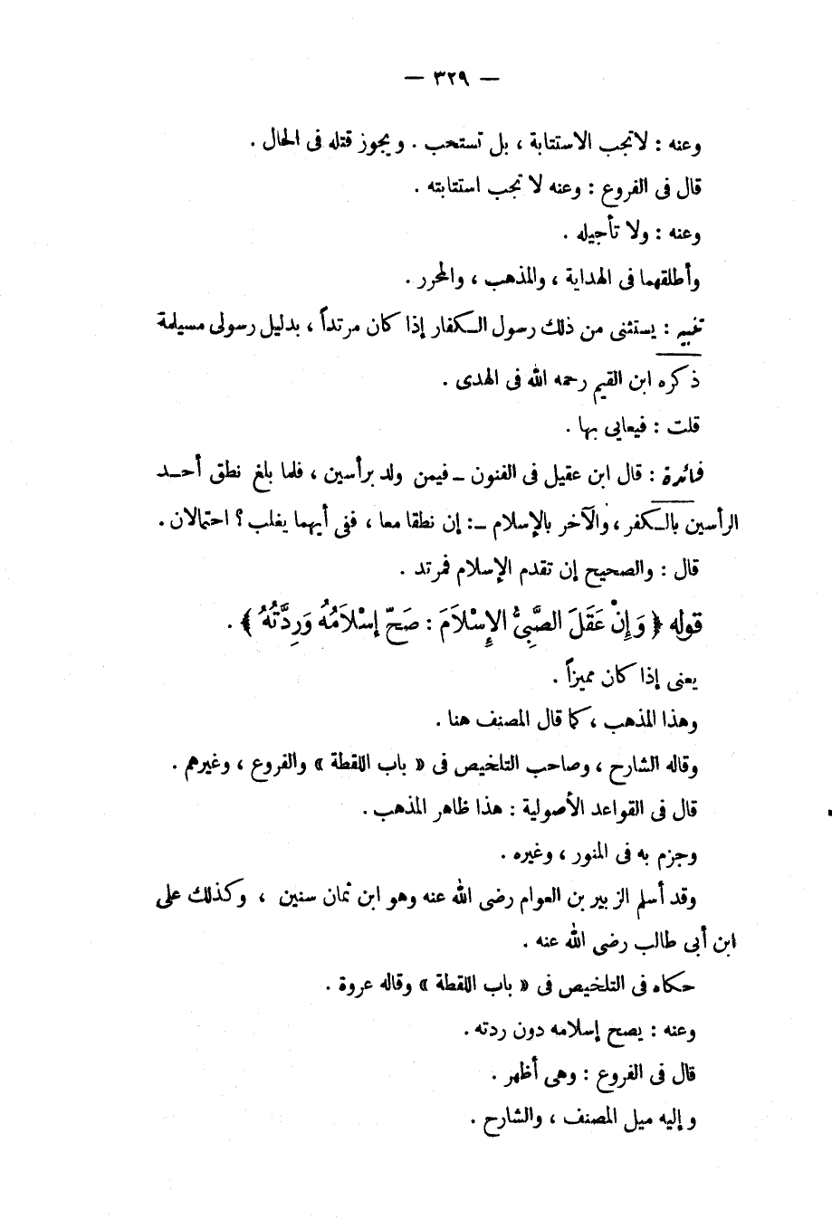 قَوْلُهُ (وَإِنْ عَقَلَ الصَّبِيُّ الْإِسْلَامَ: صَحَّ إسْلَامُهُ وَرِدَّتُهُ) . يَعْنِي إذَا كَانَ مُمَيِّزًا. وَهَذَا الْمَذْهَبُ، كَمَا قَالَ الْمُصَنِّفُ هُنَا. وَقَالَهُ الشَّارِحُ، وَصَاحِبُ التَّلْخِيصِ فِي " بَابِ اللُّقَطَةِ " وَالْفُرُوعِ، وَغَيْرِهِمْ. قَالَ فِي الْقَوَاعِدِ الْأُصُولِيَّةِ: هَذَا ظَاهِرُ الْمَذْهَبِ، وَجَزَمَ بِهِ فِي الْمُنَوِّرِ، وَغَيْرِهِ. وَقَدْ أَسْلَمَ الزُّبَيْرُ بْنُ الْعَوَّامِ - رَضِيَ اللَّهُ عَنْهُ - وَهُوَ ابْنُ ثَمَانِ سِنِينَ، وَكَذَلِكَ عَلِيُّ بْنُ أَبِي طَالِبٍ - رَضِيَ اللَّهُ عَنْهُ -. حَكَاهُ فِي التَّلْخِيصِ فِي " بَابِ اللُّقَطَةِ " وَقَالَهُ عُرْوَةُ. وَعَنْهُ: يَصِحُّ إسْلَامُهُ دُونَ رِدَّتِهِ. قَالَ فِي الْفُرُوعِ: وَهِيَ أَظْهَرُ. وَإِلَيْهِ مَيْلُ الْمُصَنِّفِ وَالشَّارِحِ.