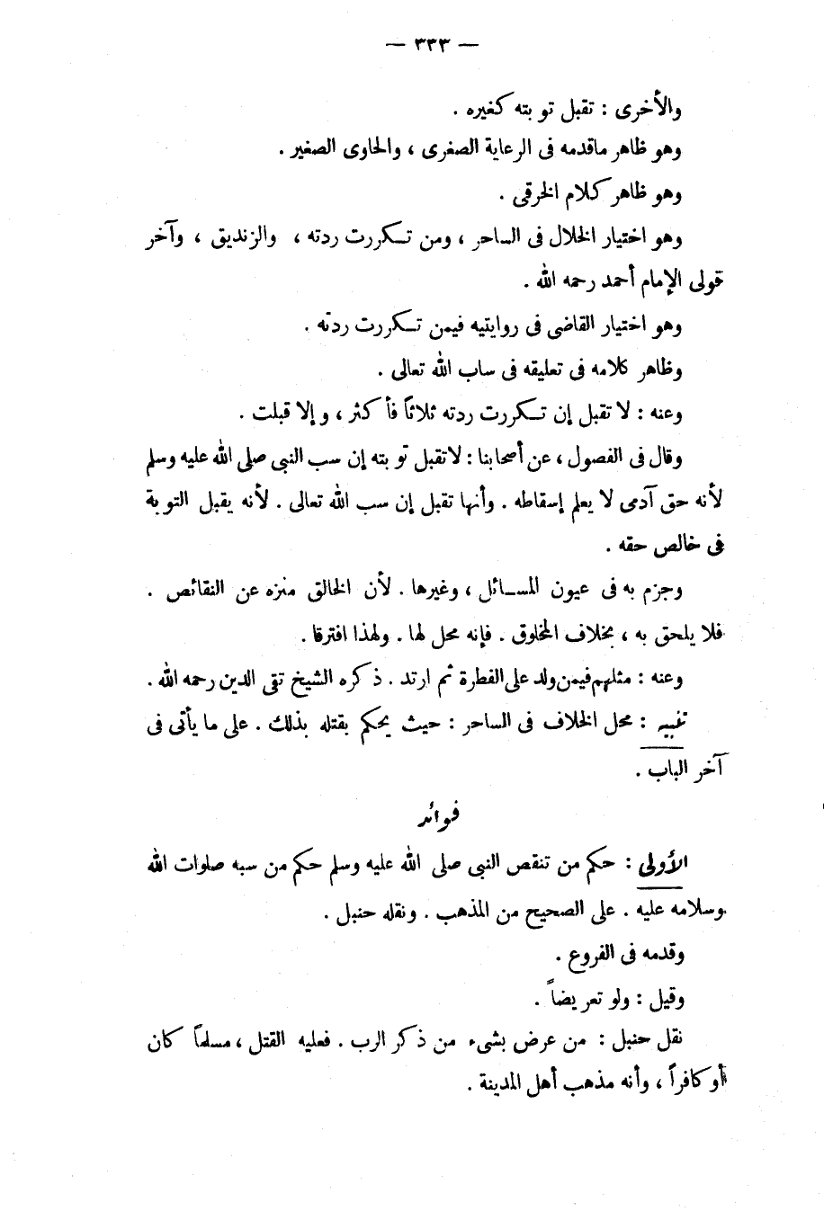تَنْبِيهٌ: مَحَلُّ الْخِلَافِ فِي السَّاحِرِ: حَيْثُ يُحْكَمُ بِقَتْلِهِ بِذَلِكَ عَلَى مَا يَأْتِي فِي آخِرِ الْبَابِ. فَوَائِدُ الْأُولَى: حُكْمُ مَنْ تَنَقَّصَ النَّبِيَّ - صَلَّى اللَّهُ عَلَيْهِ وَسَلَّمَ - حُكْمُ مَنْ سَبَّهُ صَلَوَاتُ اللَّهِ وَسَلَامُهُ عَلَيْهِ عَلَى الصَّحِيحِ مِنْ الْمَذْهَبِ. وَنَقَلَهُ حَنْبَلٌ، وَقَدَّمَهُ فِي الْفُرُوعِ. وَقِيلَ: وَلَوْ تَعْرِيضًا. نَقَلَ حَنْبَلٌ: مَنْ عَرَّضَ بِشَيْءٍ مِنْ ذِكْرِ الرَّبِّ. فَعَلَيْهِ الْقَتْلُ، مُسْلِمًا كَانَ أَوْ كَافِرًا، وَأَنَّهُ مَذْهَبُ أَهْلِ الْمَدِينَةِ.