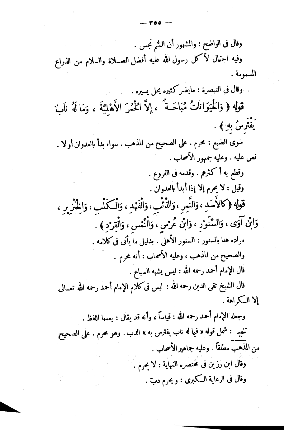 تَنْبِيهٌ: شَمِلَ قَوْلُهُ " فِيمَا لَهُ نَابٌ يَفْتَرِسُ بِهِ " الدُّبَّ. وَهُوَ مُحَرَّمٌ عَلَى الصَّحِيحِ مِنْ الْمَذْهَبِ مُطْلَقًا. وَعَلَيْهِ جَمَاهِيرُ الْأَصْحَابِ. وَقَالَ ابْنُ رَزِينٍ فِي مُخْتَصَرِهِ النِّهَايَةِ: لَا يَحْرُمُ. وَقَالَ فِي الرِّعَايَةِ الْكُبْرَى: وَيَحْرُمُ دُبٌّ.