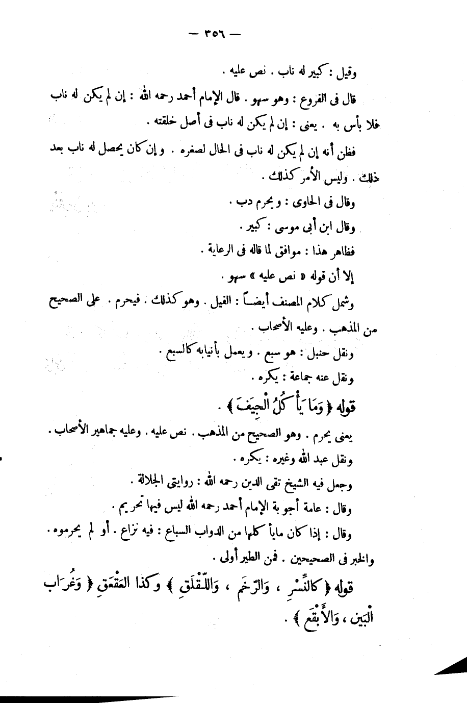 وَقِيلَ: كَبِيرٌ لَهُ نَابٌ، نَصَّ عَلَيْهِ. قَالَ فِي الْفُرُوعِ: وَهُوَ سَهْوٌ. قَالَ الْإِمَامُ أَحْمَدُ - رَحِمَهُ اللَّهُ -: إنْ لَمْ يَكُنْ لَهُ نَابٌ فَلَا بَأْسَ بِهِ. يَعْنِي: إنْ لَمْ يَكُنْ لَهُ نَابٌ فِي أَصْلِ خِلْقَتِهِ. فَظَنَّ أَنَّهُ إنْ لَمْ يَكُنْ لَهُ نَابٌ فِي الْحَالِ لِصِغَرِهِ. وَإِنْ كَانَ يَحْصُلُ لَهُ نَابٌ بَعْدَ ذَلِكَ. وَلَيْسَ الْأَمْرُ كَذَلِكَ. وَقَالَ فِي الْحَاوِي: وَيَحْرُمُ دُبٌّ. وَقَالَ ابْنُ أَبِي مُوسَى: كَبِيرٌ. فَظَاهِرُ هَذَا مُوَافِقٌ لِمَا قَالَهُ فِي الرِّعَايَةِ. إلَّا أَنَّ قَوْلَهُ " نَصَّ عَلَيْهِ " سَهْوٌ. وَشَمِلَ كَلَامُ الْمُصَنِّفِ أَيْضًا: الْفِيلَ. وَهُوَ كَذَلِكَ. فَيَحْرُمُ عَلَى الصَّحِيحِ مِنْ الْمَذْهَبِ. وَعَلَيْهِ الْأَصْحَابُ. وَنَقَلَ حَنْبَلٌ: هُوَ سَبُعٌ. وَيَعْمَلُ بِأَنْيَابِهِ كَالسَّبُعِ. وَنَقَلَ عَنْهُ جَمَاعَةٌ: يُكْرَهُ.