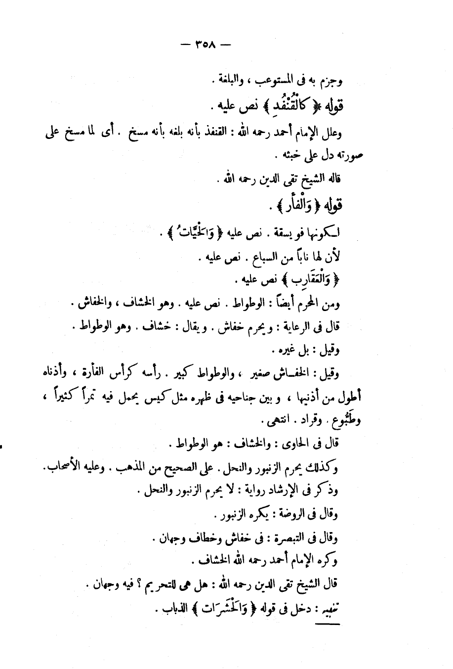 وَجَزَمَ بِهِ فِي الْمُسْتَوْعِبِ، وَالْبُلْغَةِ. قَوْلُهُ (كَالْقُنْفُذِ) نَصَّ عَلَيْهِ. وَعَلَّلَ الْإِمَامُ أَحْمَدُ - رَحِمَهُ اللَّهُ -: الْقُنْفُذَ بِأَنَّهُ بَلَغَهُ بِأَنَّهُ مُسِخَ. أَيْ لَمَّا مُسِخَ عَلَى صُورَتِهِ دَلَّ عَلَى خُبْثِهِ. قَالَهُ الشَّيْخُ تَقِيُّ الدِّينِ - رَحِمَهُ اللَّهُ -. قَوْلُهُ (وَالْفَأْرِ) ؛ لِكَوْنِهَا فُوَيْسِقَةً. نَصَّ عَلَيْهِ (وَالْحَيَّاتِ) ؛ لِأَنَّ لَهَا نَابًا مِنْ السِّبَاعِ، نَصَّ عَلَيْهِ. (وَالْعَقَارِبِ) نَصَّ عَلَيْهِ. وَمِنْ الْمُحَرَّمِ أَيْضًا: الْوَطْوَاطُ، نَصَّ عَلَيْهِ. وَهُوَ الْخُشَّافُ، وَالْخُفَّاشُ. قَالَ فِي الرِّعَايَةِ: وَيَحْرُمُ خُفَّاشٌ. وَيُقَالُ: خَشَّافٌ. وَهُوَ الْوَطْوَاطُ. وَقِيلَ: بَلْ غَيْرُهُ. وَقِيلَ: الْخُفَّاشُ صَغِيرٌ، وَالْوَطْوَاطُ كَبِيرٌ. رَأْسُهُ كَرَأْسِ الْفَأْرَةِ، وَأُذُنَاهُ أَطْوَلُ مِنْ أُذُنَيْهَا، وَبَيْنَ جَنَاحَيْهِ فِي ظَهْرِهِ مِثْلُ كِيسٍ يَحْمِلُ فِيهِ تَمْرًا كَثِيرًا، وَطَبُّوعٌ. وَقُرَادٌ. انْتَهَى. قَالَ فِي الْحَاوِي: وَالْخُشَّافُ: هُوَ الْوَطْوَاطُ. وَكَذَلِكَ يَحْرُمُ الزُّنْبُورُ وَالنَّحْلُ عَلَى الصَّحِيحِ مِنْ الْمَذْهَبِ. وَعَلَيْهِ الْأَصْحَابُ. وَذَكَرَ فِي الْإِرْشَادِ رِوَايَةً: لَا يَحْرُمُ الزُّنْبُورُ وَالنَّحْلُ. وَقَالَ فِي الرَّوْضَةِ: يُكْرَهُ الزُّنْبُورُ. وَقَالَ فِي التَّبْصِرَةِ: فِي خُفَّاشٍ وَخَطَّافٍ وَجْهَانِ. وَكَرِهَ الْإِمَامُ أَحْمَدُ - رَحِمَهُ اللَّهُ - الْخُشَّافَ. قَالَ الشَّيْخُ تَقِيُّ الدِّينِ - رَحِمَهُ اللَّهُ -: هَلْ هِيَ لِلتَّحْرِيمِ؟ فِيهِ وَجْهَانِ.