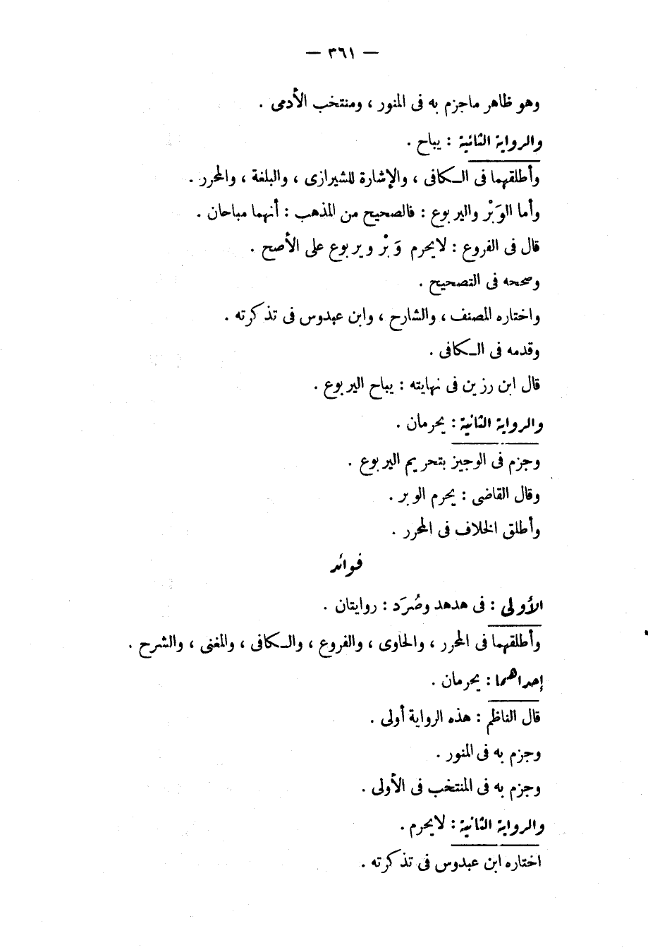 وَهُوَ ظَاهِرُ مَا جَزَمَ بِهِ فِي الْمُنَوِّرِ، وَمُنْتَخَبِ الْأَدَمِيِّ. وَالرِّوَايَةُ الثَّانِيَةُ: يُبَاحُ. وَأَطْلَقَهُمَا فِي الْكَافِي، وَالْإِشَارَةِ لِلشِّيرَازِيِّ، وَالْبُلْغَةِ، وَالْمُحَرَّرِ. وَأَمَّا الْوَبَرُ وَالْيَرْبُوعُ: فَالصَّحِيحُ مِنْ الْمَذْهَبِ: أَنَّهُمَا مُبَاحَانِ. قَالَ فِي الْفُرُوعِ: لَا يَحْرُمُ وَبَرٌ وَيَرْبُوعٌ عَلَى الْأَصَحِّ، وَصَحَّحَهُ فِي التَّصْحِيحِ، وَاخْتَارَهُ الْمُصَنِّفُ، وَالشَّارِحُ، وَابْنُ عَبْدُوسٍ فِي تَذْكِرَتِهِ، وَقَدَّمَهُ فِي الْكَافِي. قَالَ ابْنُ رَزِينٍ فِي نِهَايَتِهِ: يُبَاحُ الْيَرْبُوعُ. وَالرِّوَايَةُ الثَّانِيَةُ: يَحْرُمَانِ، وَجَزَمَ فِي الْوَجِيزِ بِتَحْرِيمِ الْيَرْبُوعِ. وَقَالَ الْقَاضِي: يَحْرُمُ الْوَبَرُ. وَأَطْلَقَ الْخِلَافَ فِي الْمُحَرَّرِ.