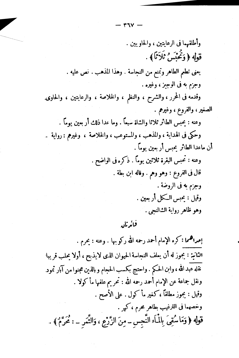 وَأَطْلَقَهُمَا فِي الرِّعَايَتَيْنِ، وَالْحَاوِيَيْنِ. قَوْلُهُ (وَتُحْبَسُ ثَلَاثًا) . يَعْنِي تُطْعَمُ الطَّاهِرَ وَتُمْنَعُ مِنْ النَّجَاسَةِ. وَهَذَا الْمَذْهَبُ، نَصَّ عَلَيْهِ، وَجَزَمَ بِهِ فِي الْوَجِيزِ، وَغَيْرِهِ، وَقَدَّمَهُ فِي الْمُحَرَّرِ، وَالشَّرْحِ، وَالنَّظْمِ، وَالْخُلَاصَةِ، وَالرِّعَايَتَيْنِ، وَالْحَاوِي الصَّغِيرِ، وَالْفُرُوعِ، وَغَيْرِهِمْ. وَعَنْهُ: يُحْبَسُ الطَّائِرُ ثَلَاثًا وَالشَّاةُ سَبْعًا. وَمَا عَدَا ذَلِكَ أَرْبَعِينَ يَوْمًا. وَحُكِيَ فِي الْهِدَايَةِ، وَالْمُذْهَبِ، وَالْمُسْتَوْعِبِ، وَالْخُلَاصَةِ، وَغَيْرِهِمْ: رِوَايَةً أَنَّ مَا عَدَا الطَّائِرَ يُحْبَسُ أَرْبَعِينَ يَوْمًا. وَعَنْهُ: تُحْبَسُ الْبَقَرَةُ ثَلَاثِينَ يَوْمًا. ذَكَرَهُ فِي الْوَاضِحِ. قَالَ فِي الْفُرُوعِ: وَهُوَ وَهْمٌ. وَقَالَهُ ابْنُ بَطَّةَ، وَجَزَمَ بِهِ فِي الرَّوْضَةِ. وَقِيلَ: يُحْبَسُ الْكُلُّ أَرْبَعِينَ. وَهُوَ ظَاهِرُ رِوَايَةِ الشَّالَنْجِيِّ.
