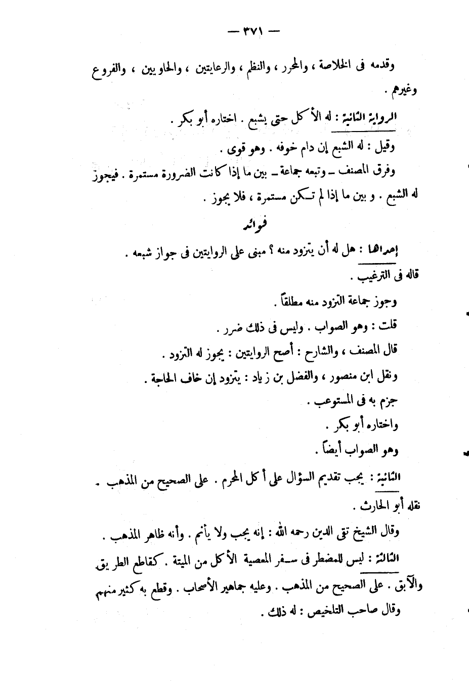 وَقَدَّمَهُ فِي الْخُلَاصَةِ، وَالْمُحَرَّرِ، وَالنَّظْمِ، وَالرِّعَايَتَيْنِ، وَالْحَاوِيَيْنِ، وَالْفُرُوعِ وَغَيْرِهِمْ. الرِّوَايَةُ الثَّانِيَةُ: لَهُ الْأَكْلُ حَتَّى يَشْبَعَ. اخْتَارَهُ أَبُو بَكْرٍ. وَقِيلَ: لَهُ الشِّبَعُ إنْ دَامَ خَوْفُهُ. وَهُوَ قَوِيٌّ. وَفَرَّقَ الْمُصَنِّفُ وَتَبِعَهُ جَمَاعَةٌ بَيْنَ مَا إذَا كَانَتْ الضَّرُورَةُ مُسْتَمِرَّةً. فَيَجُوزُ لَهُ الشِّبَعُ. وَبَيْنَ مَا إذَا لَمْ تَكُنْ مُسْتَمِرَّةً، فَلَا يَجُوزُ. فَوَائِدُ إحْدَاهَا: هَلْ لَهُ أَنْ يَتَزَوَّدَ مِنْهُ؟ مَبْنِيٌّ عَلَى الرِّوَايَتَيْنِ فِي جَوَازِ شِبَعِهِ. قَالَهُ فِي التَّرْغِيبِ. وَجَوَّزَ جَمَاعَةٌ التَّزَوُّدَ مِنْهُ مُطْلَقًا. قُلْت: وَهُوَ الصَّوَابُ. وَلَيْسَ فِي ذَلِكَ ضَرَرٌ. قَالَ الْمُصَنِّفُ، وَالشَّارِحُ: أَصَحُّ الرِّوَايَتَيْنِ: يَجُوزُ لَهُ التَّزَوُّدُ. وَنَقَلَ ابْنُ مَنْصُورٍ، وَالْفَضْلُ بْنُ زِيَادٍ: يَتَزَوَّدُ إنْ خَافَ الْحَاجَةَ، جَزَمَ بِهِ فِي الْمُسْتَوْعِبِ، وَاخْتَارَهُ أَبُو بَكْرٍ. وَهُوَ الصَّوَابُ أَيْضًا. الثَّانِيَةُ: يَجِبُ تَقْدِيمُ السُّؤَالِ عَلَى أَكْلِ الْمُحَرَّمِ عَلَى الصَّحِيحِ مِنْ الْمَذْهَبِ. نَقَلَهُ أَبُو الْحَارِثِ. وَقَالَ الشَّيْخُ تَقِيُّ الدِّينِ - رَحِمَهُ اللَّهُ -: إنَّهُ يَجِبُ وَلَا يَأْثَمُ. وَأَنَّهُ ظَاهِرُ الْمَذْهَبِ.