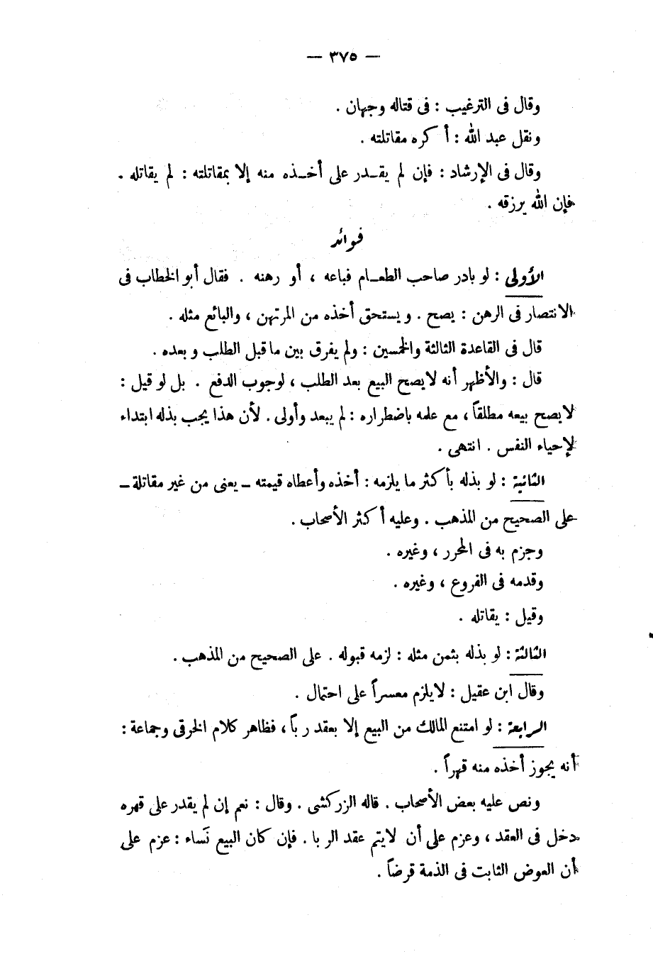 وَقَالَ فِي التَّرْغِيبِ: فِي قِتَالِهِ وَجْهَانِ. وَنَقَلَ عَبْدُ اللَّهِ: أَكْرَهُ مُقَاتَلَتَهُ. وَقَالَ فِي الْإِرْشَادِ: فَإِنْ لَمْ يَقْدِرْ عَلَى أَخْذِهِ مِنْهُ إلَّا بِمُقَاتَلَتِهِ: لَمْ يُقَاتِلْهُ. فَإِنَّ اللَّهَ يَرْزُقُهُ. فَوَائِدُ الْأُولَى: لَوْ بَادَرَ صَاحِبُ الطَّعَامِ فَبَاعَهُ، أَوْ رَهَنَهُ. فَقَالَ أَبُو الْخَطَّابِ فِي الِانْتِصَارِ فِي الرَّهْنِ: يَصِحُّ. وَيَسْتَحِقُّ أَخْذَهُ مِنْ الْمُرْتَهِنِ، وَالْبَائِعُ مِثْلُهُ. قَالَ فِي الْقَاعِدَةِ الثَّالِثَةِ وَالْخَمْسِينَ: وَلَمْ يُفَرَّقْ بَيْنَ مَا قَبْلَ الطَّلَبِ وَبَعْدَهُ. قَالَ: وَالْأَظْهَرُ أَنَّهُ لَا يَصِحُّ الْبَيْعُ بَعْدَ الطَّلَبِ، لِوُجُوبِ الدَّفْعِ. بَلْ لَوْ قِيلَ: لَا يَصِحُّ بَيْعُهُ مُطْلَقًا، مَعَ عِلْمِهِ بِاضْطِرَارِهِ: لَمْ يَبْعُدْ وَأَوْلَى؛ لِأَنَّ هَذَا يَجِبُ بَذْلُهُ ابْتِدَاءً لِإِحْيَاءِ النَّفْسِ. انْتَهَى. الثَّانِيَةُ: لَوْ بَذَلَهُ بِأَكْثَرَ مَا يَلْزَمُهُ: أَخَذَهُ وَأَعْطَاهُ قِيمَتَهُ يَعْنِي مِنْ غَيْرِ مُقَاتَلَةٍ عَلَى الصَّحِيحِ مِنْ الْمَذْهَبِ. وَعَلَيْهِ أَكْثَرُ الْأَصْحَابِ، وَجَزَمَ بِهِ فِي الْمُحَرَّرِ، وَغَيْرِهِ، وَقَدَّمَهُ فِي الْفُرُوعِ، وَغَيْرِهِ. وَقِيلَ: يُقَاتِلُهُ. الثَّالِثَةُ: لَوْ بَذَلَهُ بِثَمَنِ مِثْلِهِ: لَزِمَهُ قَبُولُهُ عَلَى الصَّحِيحِ مِنْ الْمَذْهَبِ. وَقَالَ ابْنُ عَقِيلٍ: لَا يَلْزَمُ مُعْسِرًا عَلَى احْتِمَالٍ. الرَّابِعَةُ: لَوْ امْتَنَعَ الْمَالِكُ مِنْ الْبَيْعِ إلَّا بِعَقْدِ رِبًا، فَظَاهِرُ كَلَامِ الْخِرَقِيِّ وَجَمَاعَةٍ: أَنَّهُ يَجُوزُ أَخْذُهُ مِنْهُ قَهْرًا، وَنَصَّ عَلَيْهِ بَعْضُ الْأَصْحَابِ. قَالَهُ الزَّرْكَشِيُّ. وَقَالَ: نَعَمْ إنْ لَمْ يَقْدِرْ عَلَى قَهْرِهِ دَخَلَ فِي الْعَقْدِ، وَعَزَمَ عَلَى أَنْ لَا يُتِمَّ عَقْدَ الرِّبَا. فَإِنْ كَانَ الْبَيْعُ نَسَاءً: عَزَمَ عَلَى أَنَّ الْعِوَضَ الثَّابِتَ فِي الذِّمَّةِ قَرْضًا.