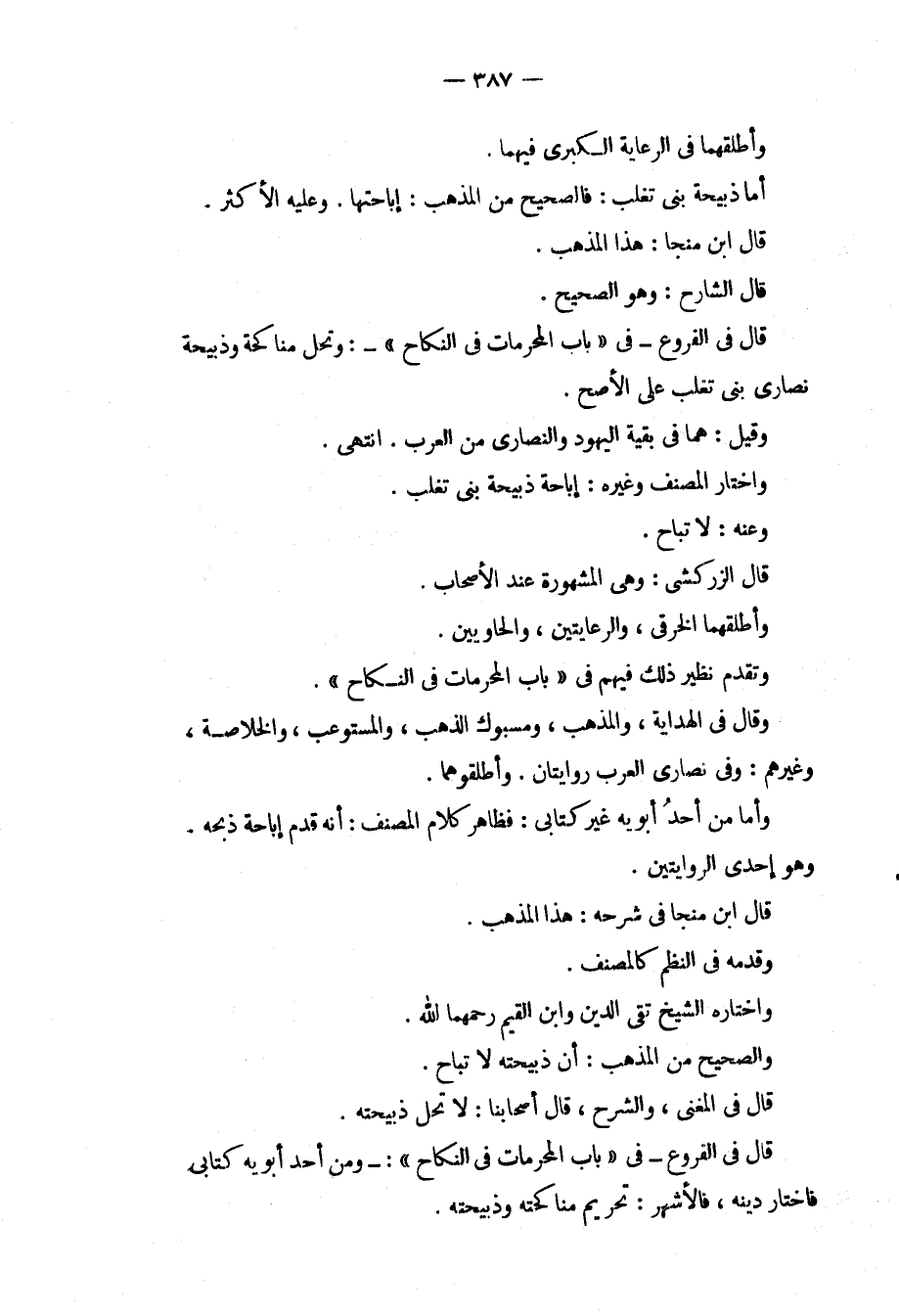 وَأَطْلَقَهُمَا فِي الرِّعَايَةِ الْكُبْرَى فِيهِمَا. أَمَّا ذَبِيحَةُ بَنِي تَغْلِبَ: فَالصَّحِيحُ مِنْ الْمَذْهَبِ: إبَاحَتُهَا. وَعَلَيْهِ الْأَكْثَرُ. قَالَ ابْنُ مُنَجَّا: هَذَا الْمَذْهَبُ. قَالَ الشَّارِحُ: وَهُوَ الصَّحِيحُ. قَالَ فِي الْفُرُوعِ فِي " بَابِ الْمُحَرَّمَاتِ فِي النِّكَاحِ ": وَتَحِلُّ مُنَاكَحَةُ وَذَبِيحَةُ نَصَارَى بَنِي تَغْلِبَ عَلَى الْأَصَحِّ. وَقِيلَ: هُمَا فِي بَقِيَّةِ الْيَهُودِ وَالنَّصَارَى مِنْ الْعَرَبِ. انْتَهَى، وَاخْتَارَ الْمُصَنِّفُ وَغَيْرُهُ: إبَاحَةَ ذَبِيحَةِ بَنِي تَغْلِبَ. وَعَنْهُ: لَا تُبَاحُ. قَالَ الزَّرْكَشِيُّ: وَهِيَ الْمَشْهُورَةُ عِنْدَ الْأَصْحَابِ. وَأَطْلَقَهُمَا الْخِرَقِيُّ، وَالرِّعَايَتَيْنِ، وَالْحَاوِيَيْنِ. وَتَقَدَّمَ نَظِيرُ ذَلِكَ فِيهِمْ فِي " بَابِ الْمُحَرَّمَاتِ فِي النِّكَاحِ ". وَقَالَ فِي الْهِدَايَةِ، وَالْمُذْهَبِ، وَمَسْبُوكِ الذَّهَبِ، وَالْمُسْتَوْعِبِ، وَالْخُلَاصَةِ، وَغَيْرِهِمْ: وَفِي نَصَارَى الْعَرَبِ رِوَايَتَانِ. وَأَطْلَقُوهُمَا.