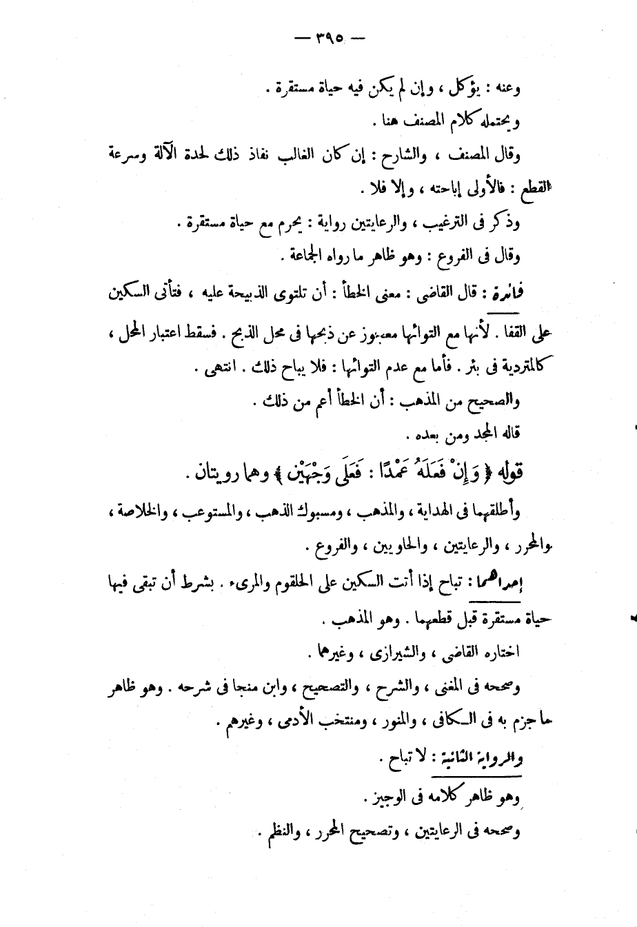 وَعَنْهُ: يُؤْكَلُ، وَإِنْ لَمْ يَكُنْ فِيهِ حَيَاةٌ مُسْتَقِرَّةٌ. وَيَحْتَمِلُهُ كَلَامُ الْمُصَنِّفِ هُنَا. وَقَالَ الْمُصَنِّفُ، وَالشَّارِحُ: إنْ كَانَ الْغَالِبُ نَفَاذَ ذَلِكَ لِحِدَةِ الْآلَةِ وَسُرْعَةِ الْقَطْعِ: فَالْأَوْلَى إبَاحَتُهُ، وَإِلَّا فَلَا. وَذَكَرَ فِي التَّرْغِيبِ، وَالرِّعَايَتَيْنِ رِوَايَةً: يَحْرُمُ مَعَ حَيَاةٍ مُسْتَقِرَّةٍ. وَقَالَ فِي الْفُرُوعِ: وَهُوَ ظَاهِرُ مَا رَوَاهُ الْجَمَاعَةُ فَائِدَةٌ: قَالَ الْقَاضِي: مَعْنَى الْخَطَأِ: أَنْ تَلْتَوِيَ الذَّبِيحَةُ عَلَيْهِ، فَتَأْتِيَ السِّكِّينُ عَلَى الْقَفَا؛ لِأَنَّهَا مَعَ الْتِوَائِهَا مَعْجُوزٌ عَنْ ذَبْحِهَا فِي مَحَلِّ الذَّبْحِ. فَسَقَطَ اعْتِبَارُ الْمَحَلِّ كَالْمُتَرَدِّيَةِ فِي بِئْرٍ. فَأَمَّا مَعَ عَدَمِ الْتِوَائِهَا: فَلَا يُبَاحُ ذَلِكَ. انْتَهَى، وَالصَّحِيحُ مِنْ الْمَذْهَبِ: أَنَّ الْخَطَأَ أَعَمُّ مِنْ ذَلِكَ. قَالَهُ الْمَجْدُ وَمَنْ بَعْدَهُ. قَوْلُهُ (وَإِنْ فَعَلَهُ عَمْدًا: فَعَلَى وَجْهَيْنِ) وَهُمَا رِوَايَتَانِ. وَأَطْلَقَهُمَا فِي الْهِدَايَةِ، وَالْمُذْهَبِ، وَمَسْبُوكِ الذَّهَبِ، وَالْمُسْتَوْعِبِ، وَالْخُلَاصَةِ، وَالْمُحَرَّرِ، وَالرِّعَايَتَيْنِ، وَالْحَاوِيَيْنِ، وَالْفُرُوعِ. إحْدَاهُمَا: تُبَاحُ إذَا أَتَتْ السِّكِّينُ عَلَى الْحُلْقُومِ وَالْمَرِيءِ. بِشَرْطِ أَنْ تَبْقَى فِيهَا حَيَاةٌ مُسْتَقِرَّةٌ قَبْلَ قَطْعِهِمَا. وَهُوَ الْمَذْهَبُ، اخْتَارَهُ الْقَاضِي، وَالشِّيرَازِيُّ، وَغَيْرُهُمَا، وَصَحَّحَهُ فِي الْمُغْنِي، وَالشَّرْحِ، وَالتَّصْحِيحِ، وَابْنُ مُنَجَّا فِي شَرْحِهِ. وَهُوَ ظَاهِرُ مَا جَزَمَ بِهِ فِي الْكَافِي، وَالْمُنَوِّرِ، وَمُنْتَخَبِ الْأَدَمِيِّ، وَغَيْرِهِمْ. وَالرِّوَايَةُ الثَّانِيَةُ: لَا تُبَاحُ. وَهُوَ ظَاهِرُ كَلَامِهِ فِي الْوَجِيزِ، وَصَحَّحَهُ فِي الرِّعَايَتَيْنِ، وَتَصْحِيحِ الْمُحَرَّرِ، وَالنَّظْمِ.
