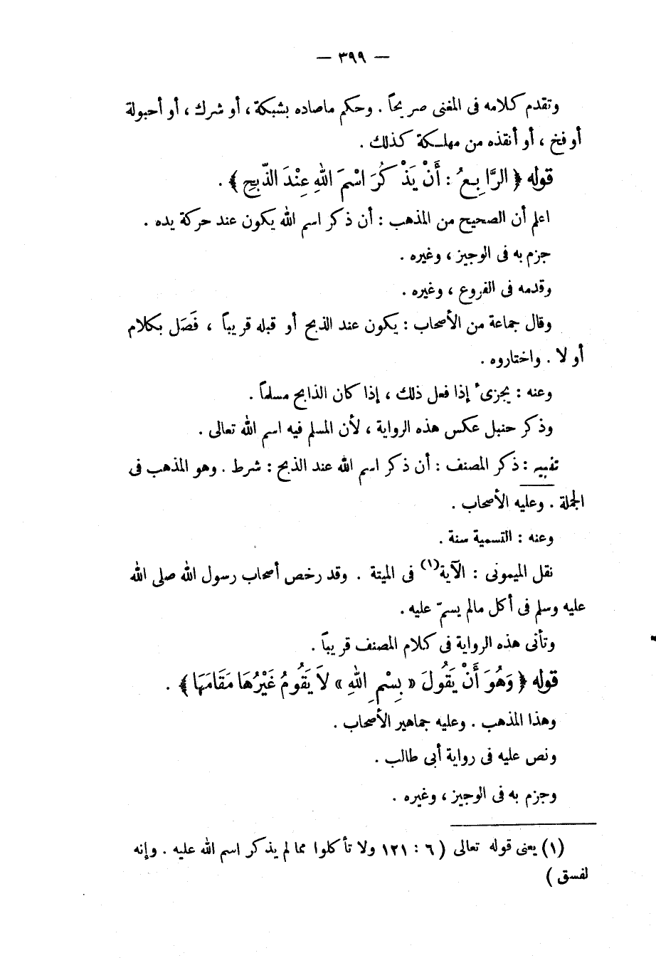 تَنْبِيهٌ: ذَكَرَ الْمُصَنِّفُ: أَنَّ ذِكْرَ اسْمِ اللَّهِ عِنْدَ الذَّبْحِ: شَرْطٌ. وَهُوَ الْمَذْهَبُ فِي الْجُمْلَةِ. وَعَلَيْهِ الْأَصْحَابُ. وَعَنْهُ: التَّسْمِيَةُ سُنَّةٌ. نَقَلَ الْمَيْمُونِيُّ: الْآيَةَ فِي الْمَيْتَةِ. وَقَدْ رَخَّصَ أَصْحَابُ رَسُولِ اللَّهِ - صَلَّى اللَّهُ عَلَيْهِ وَسَلَّمَ - فِي أَكْلِ مَا لَمْ يُسَمَّ عَلَيْهِ. وَتَأْتِي هَذِهِ الرِّوَايَةُ فِي كَلَامِ الْمُصَنِّفِ قَرِيبًا. قَوْلُهُ (وَهُوَ أَنْ يَقُولَ " بِسْمِ اللَّهِ " لَا يَقُومُ غَيْرُهَا مَقَامَهَا) . وَهَذَا الْمَذْهَبُ. وَعَلَيْهِ جَمَاهِيرُ الْأَصْحَابِ، وَنَصَّ عَلَيْهِ فِي رِوَايَةِ أَبِي طَالِبٍ، وَجَزَمَ بِهِ فِي الْوَجِيزِ، وَغَيْرِهِ.