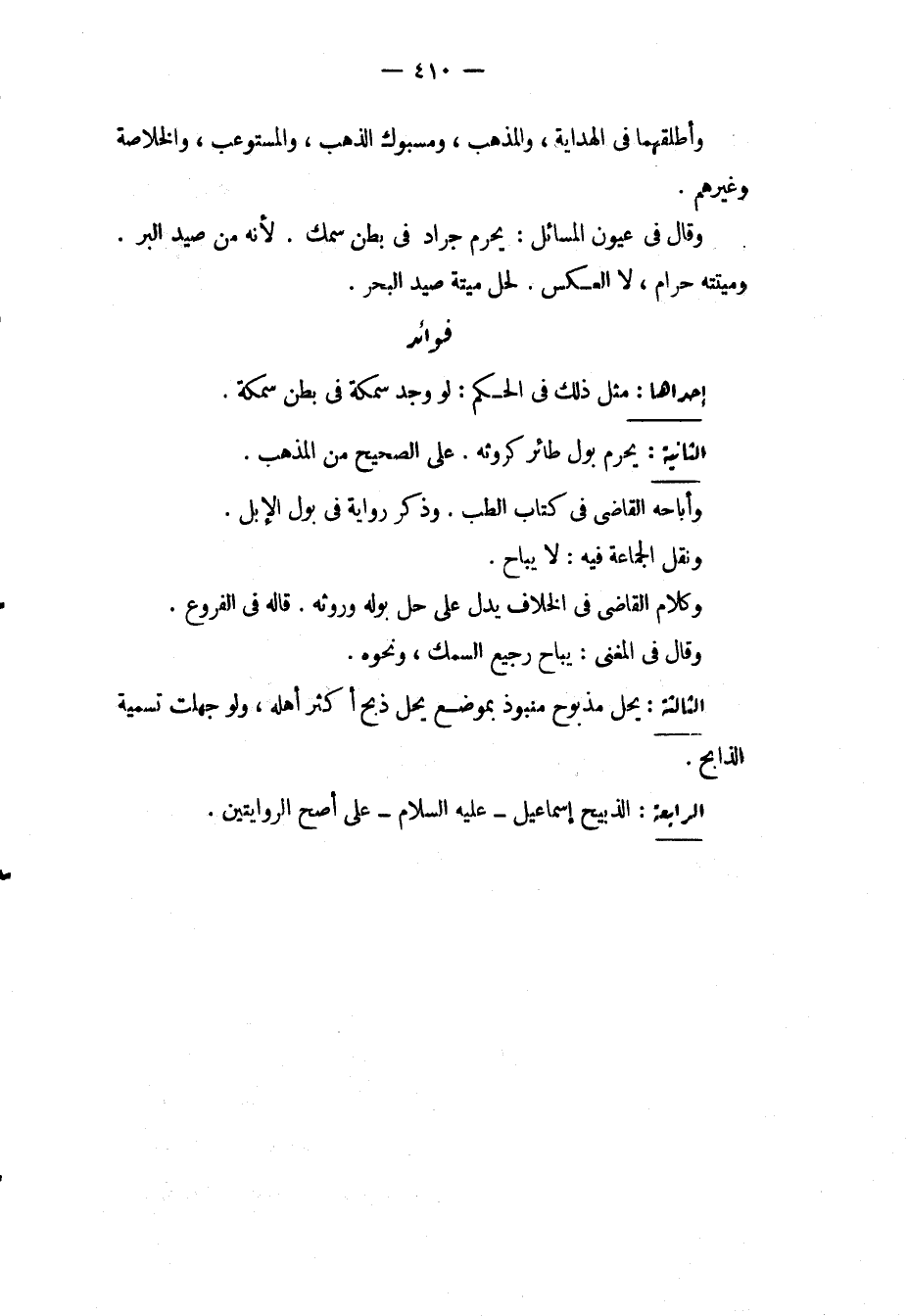 الثَّالِثَةُ: يَحِلُّ مَذْبُوحٌ مَنْبُوذٌ بِمَوْضِعٍ يَحِلُّ ذَبْحُ أَكْثَرِ أَهْلِهِ، وَلَوْ جُهِلَتْ تَسْمِيَةُ الذَّابِحِ. الرَّابِعَةُ: الذَّبِيحُ إسْمَاعِيلُ - عَلَيْهِ السَّلَامُ - عَلَى أَصَحِّ الرِّوَايَتَيْنِ.
