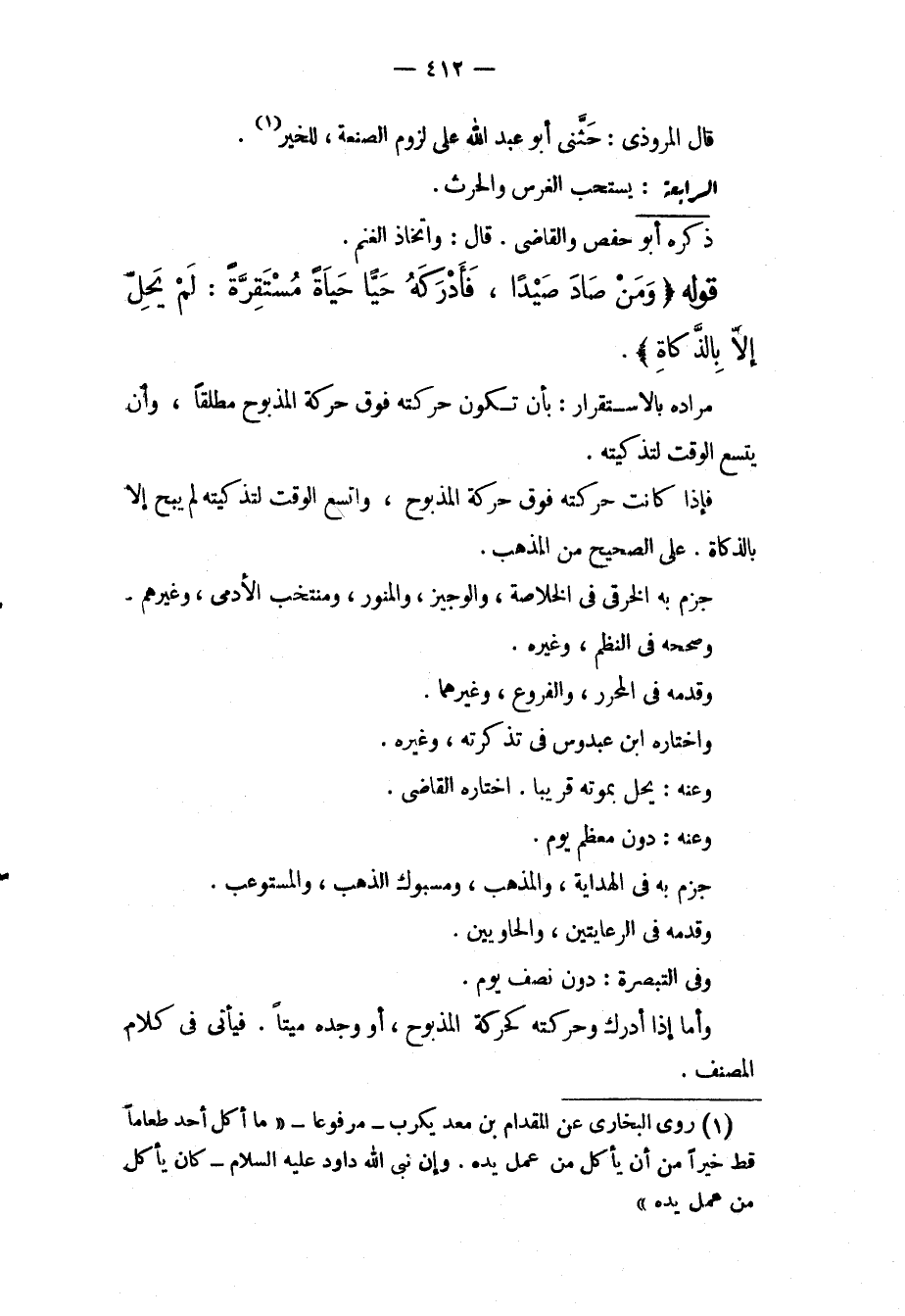 قَوْلُهُ (وَمَنْ صَادَ صَيْدًا، فَأَدْرَكَهُ حَيًّا حَيَاةً مُسْتَقِرَّةً: لَمْ يَحِلَّ إلَّا بِالذَّكَاةِ) . مُرَادُهُ بِالِاسْتِقْرَارِ: بِأَنْ تَكُونَ حَرَكَتُهُ فَوْقَ حَرَكَةِ الْمَذْبُوحِ مُطْلَقًا، وَأَنْ يَتَّسِعَ الْوَقْتُ لِتَذْكِيَتِهِ. فَإِذَا كَانَتْ حَرَكَتُهُ فَوْقَ حَرَكَةِ الْمَذْبُوحِ، وَاتَّسَعَ الْوَقْتُ لِتَذْكِيَتِهِ لَمْ يُبَحْ إلَّا بِالذَّكَاةِ عَلَى الصَّحِيحِ مِنْ الْمَذْهَبِ، جَزَمَ بِهِ الْخِرَقِيُّ فِي الْخُلَاصَةِ، وَالْوَجِيزِ، وَالْمُنَوِّرِ، وَمُنْتَخَبِ الْأَدَمِيِّ، وَغَيْرِهِمْ، وَصَحَّحَهُ فِي النَّظْمِ، وَغَيْرِهِ. وَقَدَّمَهُ فِي الْمُحَرَّرِ، وَالْفُرُوعِ، وَغَيْرِهِمَا، وَاخْتَارَهُ ابْنُ عَبْدُوسٍ فِي تَذْكِرَتِهِ، وَغَيْرُهُ. وَعَنْهُ: يَحِلُّ بِمَوْتِهِ قَرِيبًا، اخْتَارَهُ الْقَاضِي. وَعَنْهُ: دُونَ مُعْظَمِ يَوْمٍ، جَزَمَ بِهِ فِي الْهِدَايَةِ، وَالْمُذْهَبِ، وَمَسْبُوكِ الذَّهَبِ، وَالْمُسْتَوْعِبِ، وَقَدَّمَهُ فِي الرِّعَايَتَيْنِ، وَالْحَاوِيَيْنِ. وَفِي التَّبْصِرَةِ: دُونَ نِصْفِ يَوْمٍ. وَأَمَّا إذَا أُدْرِكَ وَحَرَكَتُهُ كَحَرَكَةِ الْمَذْبُوحِ، أَوْ وَجَدَهُ مَيِّتًا. فَيَأْتِي فِي كَلَامِ الْمُصَنِّفِ.