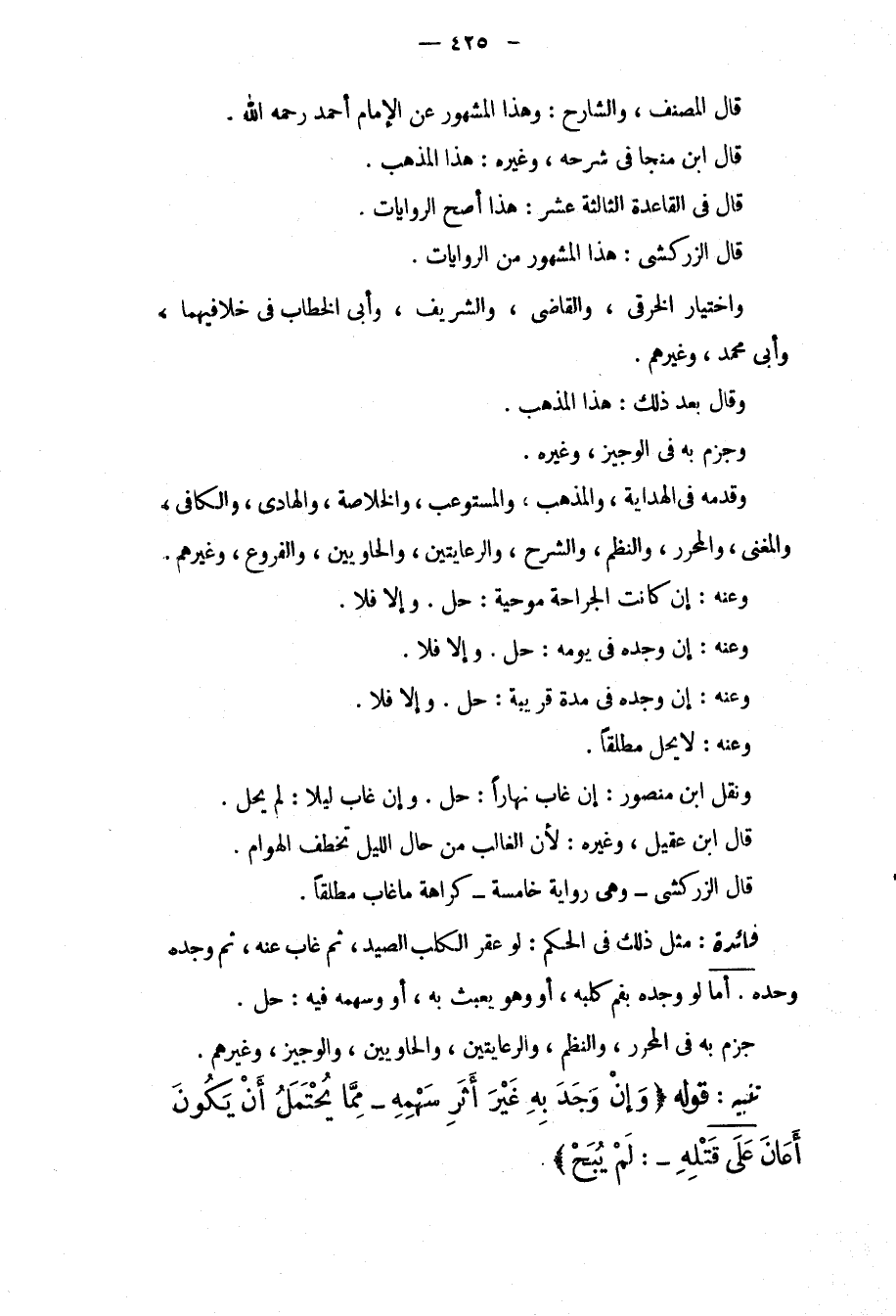 قَالَ الْمُصَنِّفُ، وَالشَّارِحُ: وَهَذَا الْمَشْهُورُ عَنْ الْإِمَامِ أَحْمَدَ - رَحِمَهُ اللَّهُ -. قَالَ ابْنُ مُنَجَّا فِي شَرْحِهِ، وَغَيْرُهُ: هَذَا الْمَذْهَبُ. قَالَ فِي الْقَاعِدَةِ الثَّالِثَةَ عَشَرَ: هَذَا أَصَحُّ الرِّوَايَاتِ قَالَ الزَّرْكَشِيُّ: هَذَا الْمَشْهُورُ مِنْ الرِّوَايَاتِ، وَاخْتِيَارُ الْخِرَقِيِّ، وَالْقَاضِي، وَالشَّرِيفِ، وَأَبِي الْخَطَّابِ فِي خِلَافَيْهِمَا، وَأَبِي مُحَمَّدٍ، وَغَيْرِهِمْ. وَقَالَ بَعْدَ ذَلِكَ: هَذَا الْمَذْهَبُ، وَجَزَمَ بِهِ فِي الْوَجِيزِ، وَغَيْرِهِ، وَقَدَّمَهُ فِي الْهِدَايَةِ، وَالْمُذْهَبِ، وَالْمُسْتَوْعِبِ، وَالْخُلَاصَةِ، وَالْهَادِي، وَالْكَافِي، وَالْمُغْنِي، وَالْمُحَرَّرِ، وَالنَّظْمِ، وَالشَّرْحِ، وَالرِّعَايَتَيْنِ، وَالْحَاوِيَيْنِ، وَالْفُرُوعِ، وَغَيْرِهِمْ. وَعَنْهُ: إنْ كَانَتْ الْجِرَاحَةُ مُوحِيَةً: حَلَّ. وَإِلَّا فَلَا. وَعَنْهُ: إنْ وَجَدَهُ فِي يَوْمِهِ: حَلَّ. وَإِلَّا فَلَا. وَعَنْهُ: إنْ وَجَدَهُ فِي مُدَّةٍ قَرِيبَةٍ: حَلَّ. وَإِلَّا فَلَا. وَعَنْهُ: لَا يَحِلُّ مُطْلَقًا. وَنَقَلَ ابْنُ مَنْصُورٍ: إنْ غَابَ نَهَارًا: حَلَّ. وَإِنْ غَابَ لَيْلًا: لَمْ يَحِلَّ. قَالَ ابْنُ عَقِيلٍ، وَغَيْرُهُ؛ لِأَنَّ الْغَالِبَ مِنْ حَالِ اللَّيْلِ تَخَطُّفُ الْهَوَامِّ. قَالَ الزَّرْكَشِيُّ وَهِيَ رِوَايَةٌ خَامِسَةٌ كَرَاهَةُ مَا غَابَ مُطْلَقًا. فَائِدَةٌ: مِثْلُ ذَلِكَ فِي الْحُكْمِ: لَوْ عَقَرَ الْكَلْبُ الصَّيْدَ، ثُمَّ غَابَ عَنْهُ، ثُمَّ وَجَدَهُ وَحْدَهُ. أَمَّا لَوْ وَجَدَهُ بِفَمِ كَلْبِهِ، أَوْ وَهُوَ يَعْبَثُ بِهِ، أَوْ وَسَهْمُهُ فِيهِ: حَلَّ، جَزَمَ بِهِ فِي الْمُحَرَّرِ، وَالنَّظْمِ، وَالرِّعَايَتَيْنِ، وَالْحَاوِيَيْنِ، وَالْوَجِيزِ، وَغَيْرِهِمْ.