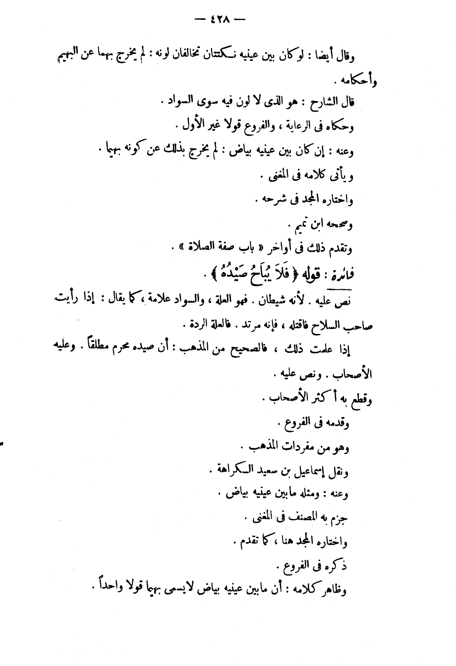 وَقَالَ أَيْضًا: لَوْ كَانَ بَيْنَ عَيْنَيْهِ نُكْتَتَانِ تُخَالِفَانِ لَوْنَهُ: لَمْ يَخْرُجْ بِهِمَا عَنْ الْبَهِيمِ وَأَحْكَامِهِ. قَالَ الشَّارِحُ: هُوَ الَّذِي لَا لَوْنَ فِيهِ سِوَى السَّوَادِ. وَحَكَاهُ فِي الرِّعَايَةِ، وَالْفُرُوعِ قَوْلًا غَيْرَ الْأَوَّلِ. وَعَنْهُ: إنْ كَانَ بَيْنَ عَيْنَيْهِ بَيَاضٌ: لَمْ يَخْرُجْ بِذَلِكَ عَنْ كَوْنِهِ بَهِيمًا. وَيَأْتِي كَلَامُهُ فِي الْمُغْنِي، وَاخْتَارَهُ الْمَجْدُ فِي شَرْحِهِ، وَصَحَّحَهُ ابْنُ تَمِيمٍ. وَتَقَدَّمَ ذَلِكَ فِي أَوَاخِرِ " بَابِ صِفَةِ الصَّلَاةِ ".