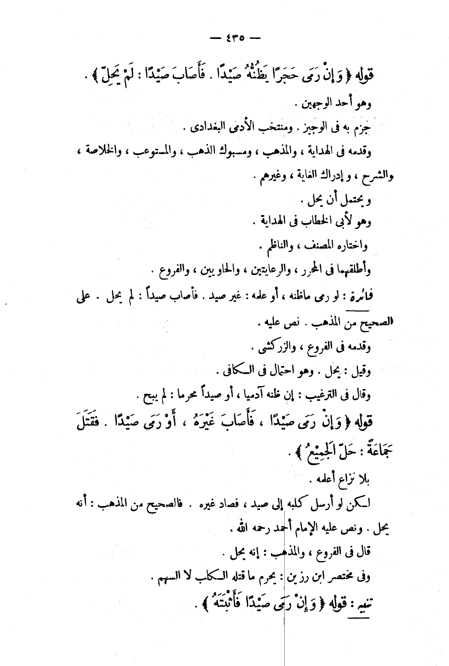 قَوْلُهُ (وَإِنْ رَمَى صَيْدًا، فَأَصَابَ غَيْرَهُ، أَوْ رَمَى صَيْدًا. فَقَتَلَ جَمَاعَةً: حَلَّ الْجَمِيعُ) . بِلَا نِزَاعٍ أَعْلَمُهُ. لَكِنْ لَوْ أَرْسَلَ كَلْبَهُ إلَى صَيْدٍ، فَصَادَ غَيْرَهُ، فَالصَّحِيحُ مِنْ الْمَذْهَبِ: أَنَّهُ يَحِلُّ، وَنَصَّ عَلَيْهِ الْإِمَامُ أَحْمَدُ - رَحِمَهُ اللَّهُ -. قَالَ فِي الْفُرُوعِ، وَالْمُذْهَبِ: إنَّهُ يَحِلُّ. وَفِي مُخْتَصَرِ ابْنِ رَزِينٍ: يَحْرُمُ مَا قَتَلَهُ الْكَلْبُ لَا السَّهْمُ.