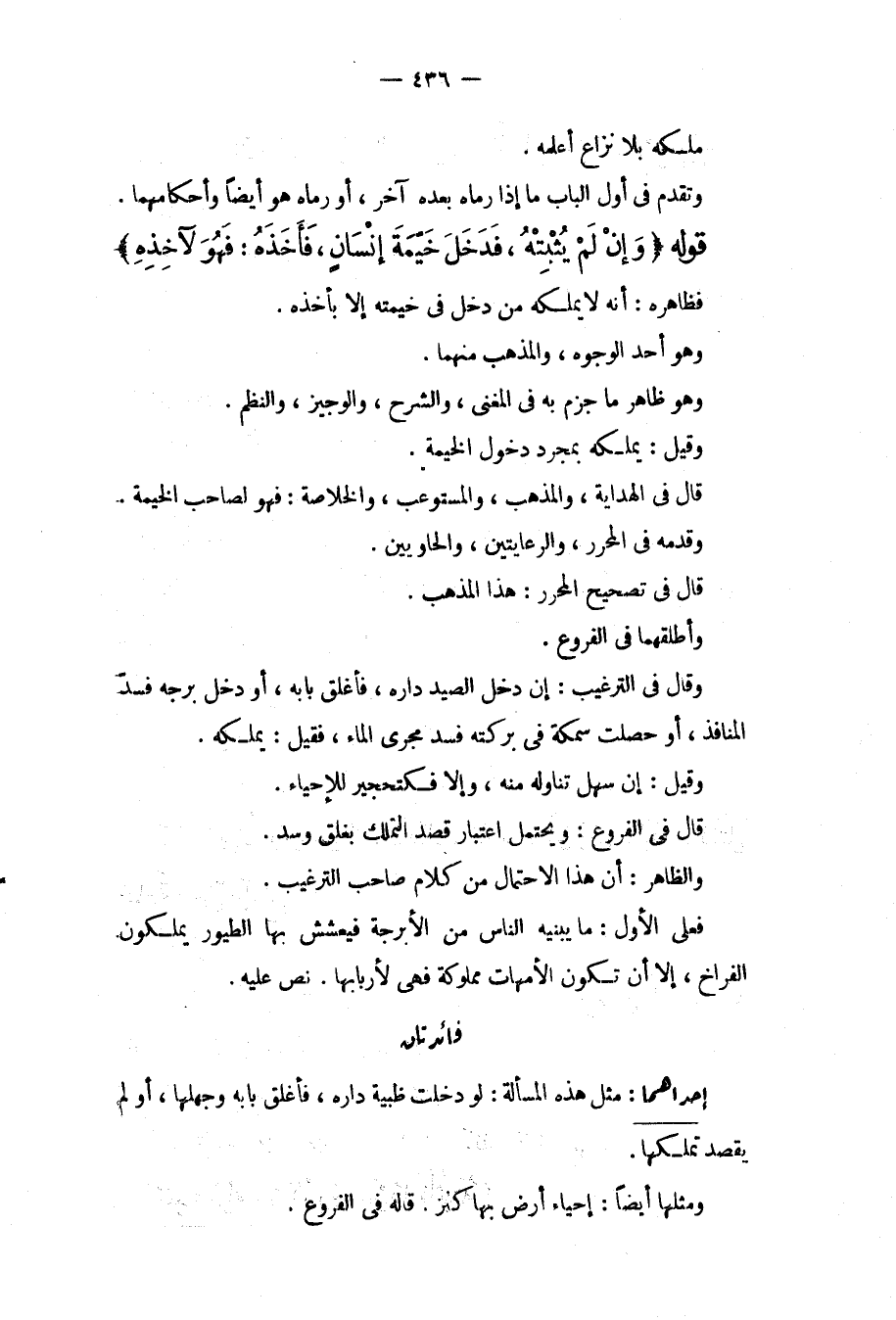 مَلَكَهُ بِلَا نِزَاعٍ أَعْلَمُهُ. وَتَقَدَّمَ فِي أَوَّلِ الْبَابِ مَا إذَا رَمَاهُ بَعْدَهُ آخَرُ، أَوْ رَمَاهُ هُوَ أَيْضًا وَأَحْكَامُهُمَا. قَوْلُهُ (وَإِنْ لَمْ يُثَبِّتْهُ، فَدَخَلَ خَيْمَةَ إنْسَانٍ، فَأَخَذَهُ: فَهُوَ لِآخِذِهِ) فَظَاهِرُهُ: أَنَّهُ لَا يَمْلِكُهُ مَنْ دَخَلَ فِي خَيْمَتِهِ إلَّا بِأَخْذِهِ. وَهُوَ أَحَدُ الْوُجُوهِ، وَالْمَذْهَبُ مِنْهُمَا. وَهُوَ ظَاهِرُ مَا جَزَمَ بِهِ فِي الْمُغْنِي، وَالشَّرْحِ، وَالْوَجِيزِ، وَالنَّظْمِ. وَقِيلَ: يَمْلِكُهُ بِمُجَرَّدِ دُخُولِ الْخَيْمَةِ. قَالَ فِي الْهِدَايَةِ، وَالْمُذْهَبِ، وَالْمُسْتَوْعِبِ، وَالْخُلَاصَةِ: فَهُوَ لِصَاحِبِ الْخَيْمَةِ، وَقَدَّمَهُ فِي الْمُحَرَّرِ، وَالرِّعَايَتَيْنِ، وَالْحَاوِيَيْنِ. قَالَ فِي تَصْحِيحِ الْمُحَرَّرِ: هَذَا الْمَذْهَبُ. وَأَطْلَقَهُمَا فِي الْفُرُوعِ. وَقَالَ فِي التَّرْغِيبِ: إنْ دَخَلَ الصَّيْدُ دَارِهِ، فَأَغْلَقَ بَابَهُ، أَوْ دَخَلَ بُرْجَهُ فَسَدَّ الْمَنَافِذَ، أَوْ حَصَلَتْ سَمَكَةٌ فِي بِرْكَتِهِ فَسَدَّ مَجْرَى الْمَاءِ، فَقِيلَ: يَمْلِكُهُ. وَقِيلَ: إنْ سَهُلَ تَنَاوُلُهُ مِنْهُ، وَإِلَّا فَكَتَحْجِيرٍ لِلْإِحْيَاءِ. قَالَ فِي الْفُرُوعِ: وَيُحْتَمَلُ اعْتِبَارُ قَصْدِ التَّمَلُّكِ بِغَلْقٍ وَسَدٍّ، وَالظَّاهِرُ: أَنَّ هَذَا الِاحْتِمَالَ مِنْ كَلَامِ صَاحِبِ التَّرْغِيبِ. فَعَلَى الْأَوَّلِ: مَا يَبْنِيهِ النَّاسُ مِنْ الْأَبْرِجَةِ فَيُعَشِّشُ بِهَا الطُّيُورُ يَمْلِكُونَ الْفِرَاخَ، إلَّا أَنْ تَكُونَ الْأُمَّهَاتُ مَمْلُوكَةً فَهِيَ لِأَرْبَابِهَا، نَصَّ عَلَيْهِ. فَائِدَتَانِ إحْدَاهُمَا: مِثْلُ هَذِهِ الْمَسْأَلَةِ: لَوْ دَخَلَتْ ظَبْيَةٌ دَارِهِ، فَأَغْلَقَ بَابَهُ وَجَهِلَهَا، أَوْ لَمْ يَقْصِدْ تَمَلَّكَهَا. وَمِثْلُهَا أَيْضًا: إحْيَاءُ أَرْضٍ بِهَا كَنْزٌ. قَالَهُ فِي الْفُرُوعِ.