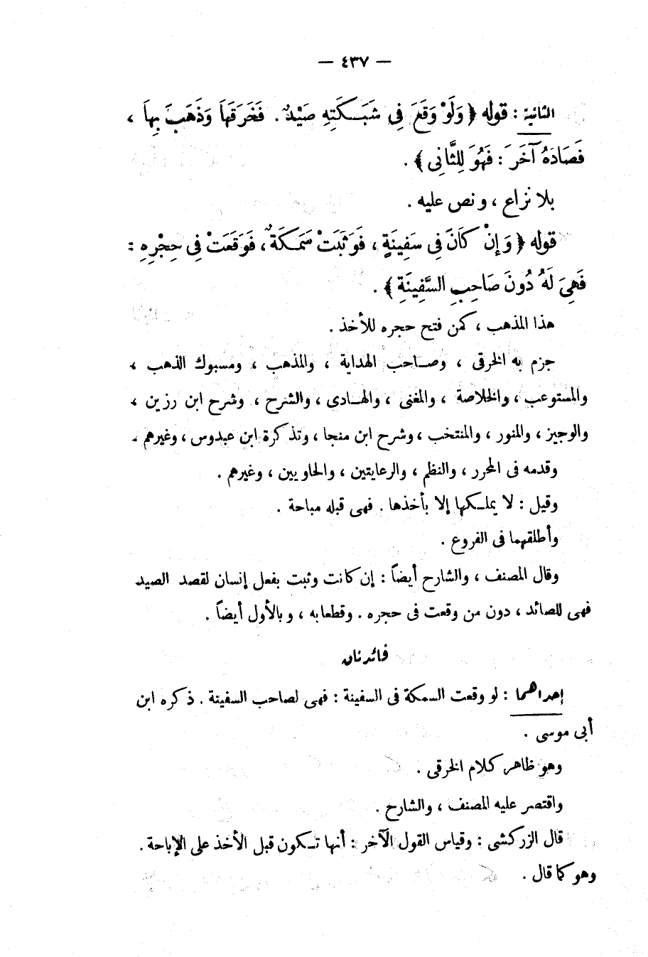 فَائِدَتَانِ إحْدَاهُمَا: لَوْ وَقَعَتْ السَّمَكَةُ فِي السَّفِينَةِ: فَهِيَ لِصَاحِبِ السَّفِينَةِ. ذَكَرَهُ ابْنُ أَبِي مُوسَى. وَهُوَ ظَاهِرُ كَلَامِ الْخِرَقِيِّ. وَاقْتَصَرَ عَلَيْهِ الْمُصَنِّفُ، وَالشَّارِحُ. قَالَ الزَّرْكَشِيُّ: وَقِيَاسُ الْقَوْلِ الْآخَرِ: أَنَّهَا تَكُونُ قَبْلَ الْأَخْذِ عَلَى الْإِبَاحَةِ وَهُوَ كَمَا قَالَ.