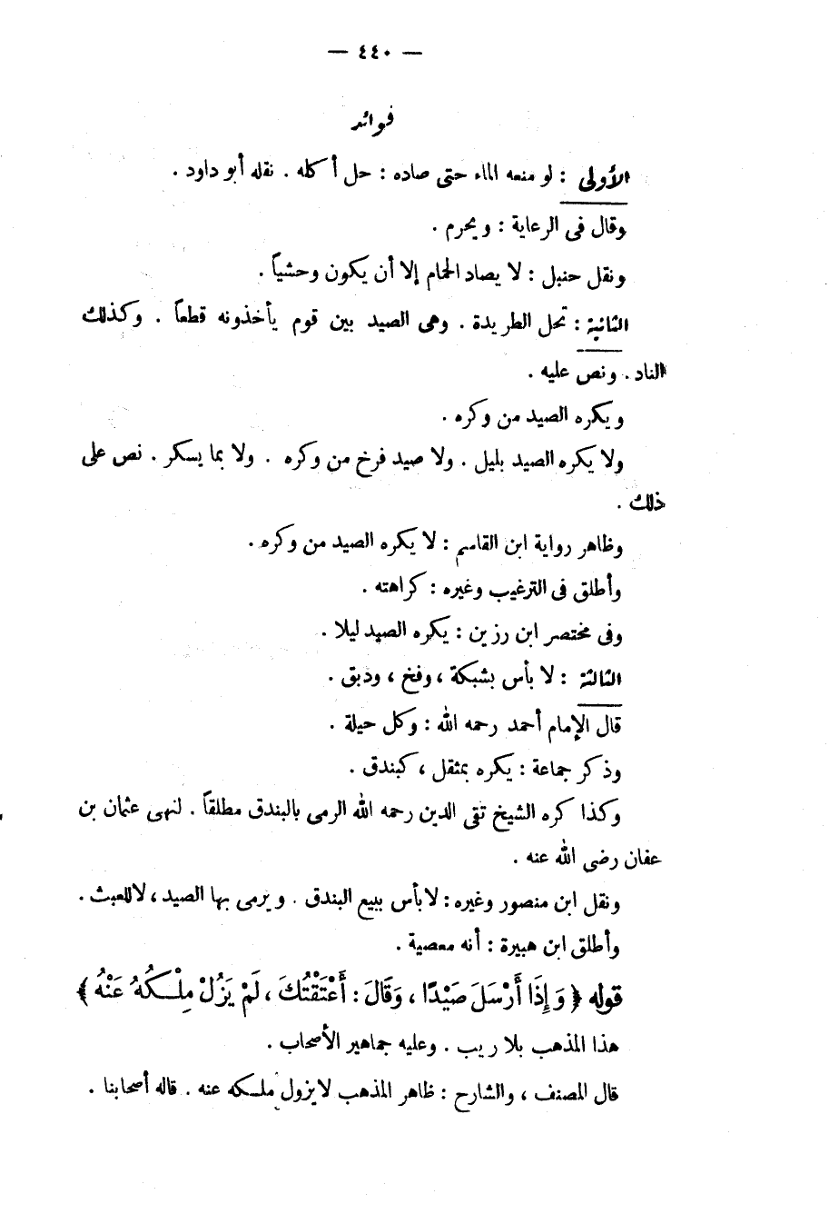 فَوَائِدُ: الْأُولَى: لَوْ مَنَعَهُ الْمَاءُ حَتَّى صَادَهُ: حَلَّ أَكْلُهُ. نَقَلَهُ أَبُو دَاوُد. وَقَالَ فِي الرِّعَايَةِ: وَيَحْرُمُ. وَنَقَلَ حَنْبَلٌ: لَا يُصَادُ الْحَمَامُ إلَّا أَنْ يَكُونَ وَحْشِيًّا. الثَّانِيَةُ: تَحِلُّ الطَّرِيدَةُ. وَهِيَ الصَّيْدُ بَيْنَ قَوْمٍ يَأْخُذُونَهُ قَطْعًا. وَكَذَلِكَ النَّادُّ، وَنَصَّ عَلَيْهِ. وَيُكْرَهُ الصَّيْدُ مِنْ وَكْرِهِ. وَلَا يُكْرَهُ الصَّيْدُ بِلَيْلٍ. وَلَا صَيْدُ فَرْخٍ مِنْ وَكْرِهِ. وَلَا بِمَا يُسْكِرُ، نَصَّ عَلَى ذَلِكَ، وَظَاهِرُ رِوَايَةِ ابْنِ الْقَاسِمِ: لَا يُكْرَهُ الصَّيْدُ مِنْ وَكْرِهِ. وَأَطْلَقَ فِي التَّرْغِيبِ وَغَيْرِهِ: كَرَاهَتَهُ. وَفِي مُخْتَصَرِ ابْنِ رَزِينٍ: يُكْرَهُ الصَّيْدُ لَيْلًا. الثَّالِثَةُ: بِلَا بَأْسٍ بِشَبَكَةٍ، وَفَخٍّ، وَدَبْقٍ. قَالَ الْإِمَامُ أَحْمَدُ - رَحِمَهُ اللَّهُ -: وَكُلِّ حِيلَةٍ. وَذَكَرَ جَمَاعَةٌ: يُكْرَهُ بِمُثْقَلٍ، كَبُنْدُقٍ. وَكَذَا كَرِهَ الشَّيْخُ تَقِيُّ الدِّينِ - رَحِمَهُ اللَّهُ - الرَّمْيَ بِالْبُنْدُقِ مُطْلَقًا. لِنَهْيِ عُثْمَانَ بْنِ عَفَّانَ - رَضِيَ اللَّهُ عَنْهُ -. وَنَقَلَ ابْنُ مَنْصُورٍ وَغَيْرُهُ: لَا بَأْسَ بِبَيْعِ الْبُنْدُقِ. وَيُرْمَى بِهَا الصَّيْدُ، لَا لِلْعَبَثِ. وَأَطْلَقَ ابْنُ هُبَيْرَةَ: أَنَّهُ مَعْصِيَةٌ.