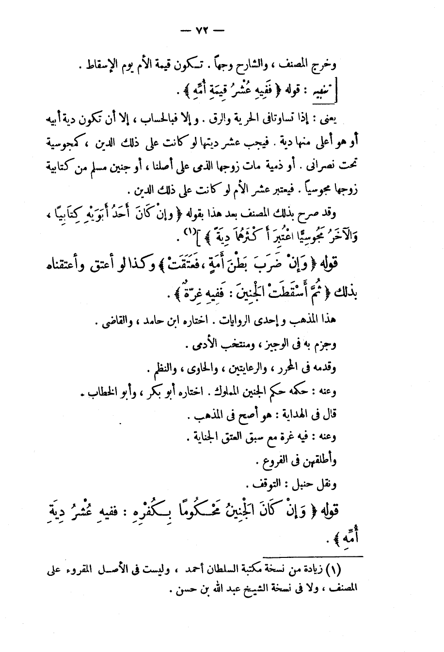 وَخَرَّجَ الْمُصَنِّفُ، وَالشَّارِحُ وَجْهًا. تَكُونُ قِيمَةُ الْأُمِّ يَوْمَ الْإِسْقَاطِ. [تَنْبِيهٌ: قَوْلُهُ (فَفِيهِ عُشْرُ قِيمَةِ أُمِّهِ) . يَعْنِي: إذَا تَسَاوَتَا فِي الْحُرِّيَّةِ وَالرِّقّ. وَإِلَّا فَبِالْحِسَابِ، إلَّا أَنْ تَكُونَ دِيَةُ أَبِيهِ أَوْ هُوَ أَعْلَى مِنْهَا دِيَةً. فَيَجِبُ عُشْرُ دِيَتِهَا لَوْ كَانَتْ عَلَى ذَلِكَ الدِّينِ، كَمَجُوسِيَّةٍ تَحْتَ نَصْرَانِيٍّ. أَوْ ذِمِّيَّةٍ مَاتَ زَوْجُهَا الذِّمِّيُّ عَلَى أَصْلِنَا، أَوْ جَنِينٍ مُسْلِمٍ مِنْ كِتَابِيَّةٍ زَوْجُهَا مَجُوسِيٌّ. فَيُعْتَبَرُ عُشْرُ الْأُمِّ لَوْ كَانَتْ عَلَى ذَلِكَ الدِّينِ. وَقَدْ صَرَّحَ بِذَلِكَ الْمُصَنِّفُ بَعْدَ هَذَا بِقَوْلِهِ (وَإِنْ كَانَ أَحَدُ أَبَوَيْهِ كِتَابِيًّا، وَالْآخَرُ مَجُوسِيًّا اُعْتُبِرَ أَكْثَرُهُمَا دِيَةً) ] .