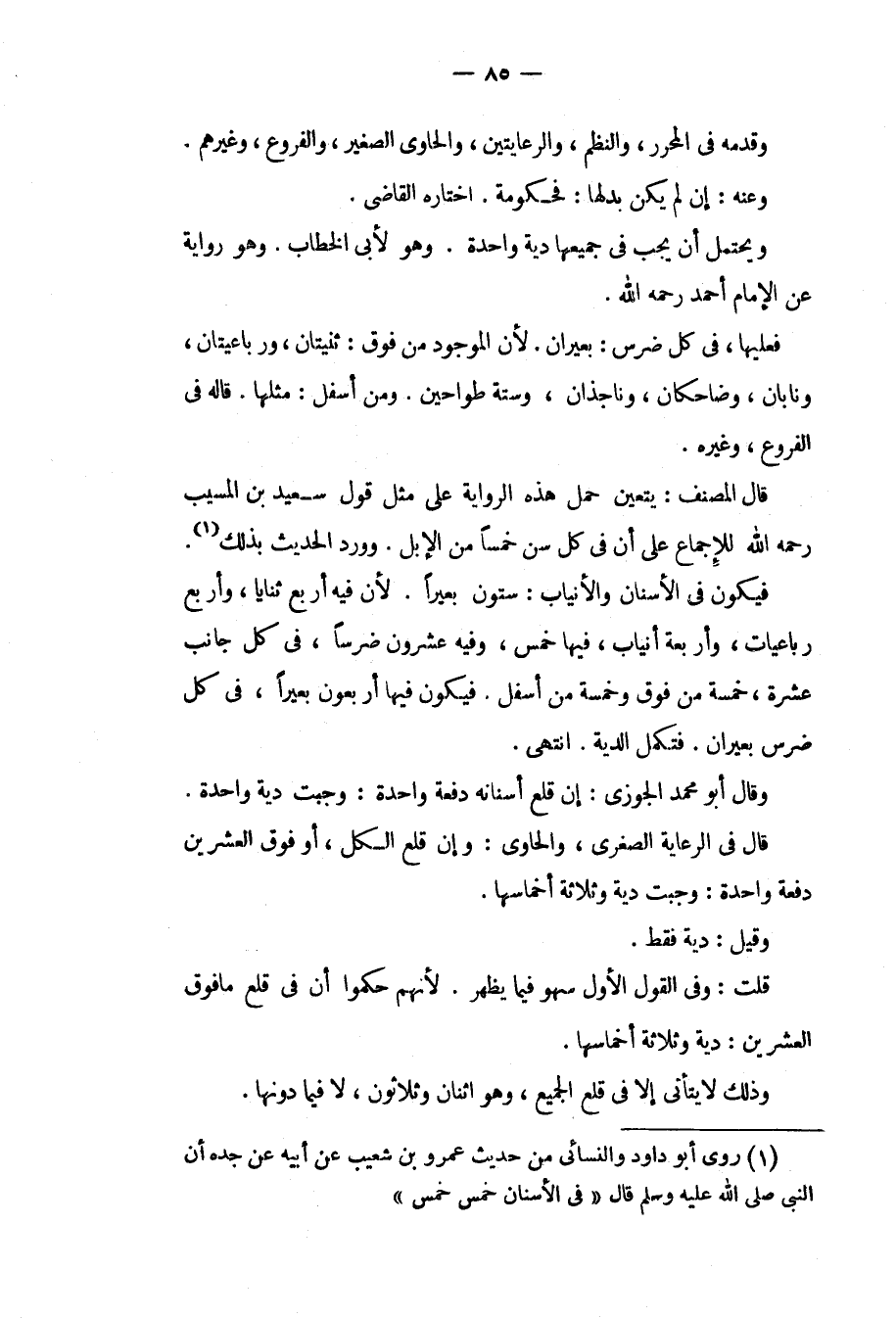 وَقَدَّمَهُ فِي الْمُحَرَّرِ، وَالنَّظْمِ، وَالرِّعَايَتَيْنِ، وَالْحَاوِي الصَّغِيرِ، وَالْفُرُوعِ، وَغَيْرِهِمْ. وَعَنْهُ: إنْ لَمْ يَكُنْ بَدَلَهَا: فَحُكُومَةٌ، اخْتَارَهُ الْقَاضِي. وَيَحْتَمِلُ أَنْ يَجِبَ فِي جَمِيعِهَا دِيَةٌ وَاحِدَةٌ. وَهُوَ لِأَبِي الْخَطَّابِ. وَهُوَ رِوَايَةٌ عَنْ الْإِمَامِ أَحْمَدَ - رَحِمَهُ اللَّهُ -. فَعَلَيْهِمَا فِي كُلِّ ضِرْسٍ بَعِيرَانِ؛ لِأَنَّ الْمَوْجُودَ مِنْ فَوْقُ ثَنِيَّتَانِ، وَرَبَاعِيَتَانِ، وَنَابَانِ، وَضَاحِكَانِ، وَنَاجِذَانِ، وَسِتَّةُ طَوَاحِينَ. وَمِنْ أَسْفَلُ مِثْلُهَا. قَالَهُ فِي الْفُرُوعِ، وَغَيْرِهِ. قَالَ الْمُصَنِّفُ: يَتَعَيَّنُ حَمْلُ هَذِهِ الرِّوَايَةِ عَلَى مِثْلِ قَوْلِ سَعِيدِ بْنِ الْمُسَيِّبِ - رَحِمَهُ اللَّهُ - لِلْإِجْمَاعِ عَلَى أَنَّ فِي كُلِّ سِنٍّ خَمْسًا مِنْ الْإِبِلِ. وَوَرَدَ الْحَدِيثُ بِذَلِكَ. فَيَكُونُ فِي الْأَسْنَانِ وَالْأَنْيَابِ: سِتُّونَ بَعِيرًا؛ لِأَنَّ فِيهِ أَرْبَعَ ثَنَايَا، وَأَرْبَعَ رَبَاعِيَاتٍ، وَأَرْبَعَةَ أَنْيَابٍ، فِيهَا خَمْسٌ، وَفِيهِ عِشْرُونَ ضِرْسًا، فِي كُلِّ جَانِبٍ عَشْرَةٌ، خَمْسَةٌ مِنْ فَوْقُ وَخَمْسَةٌ مِنْ أَسْفَلُ. فَيَكُونُ فِيهَا أَرْبَعُونَ بَعِيرًا، فِي كُلِّ ضِرْسٍ بَعِيرَانِ. فَتَكْمُلُ الدِّيَةُ. انْتَهَى. وَقَالَ أَبُو مُحَمَّدٍ الْجَوْزِيُّ: إنْ قَلَعَ أَسْنَانَهُ دَفْعَةً وَاحِدَةً: وَجَبَتْ دِيَةٌ وَاحِدَةٌ. قَالَ فِي الرِّعَايَةِ الصُّغْرَى، وَالْحَاوِي: وَإِنْ قَلَعَ الْكُلَّ، أَوْ فَوْقَ الْعِشْرِينَ دَفْعَةً وَاحِدَةً: وَجَبَتْ دِيَةٌ وَثَلَاثَةُ أَخْمَاسِهَا. وَقِيلَ: دِيَةٌ فَقَطْ. قُلْت: وَفِي الْقَوْلِ الْأَوَّلِ سَهْوٌ فِيمَا يَظْهَرُ؛ لِأَنَّهُمْ حَكَوْا أَنَّ فِي قَلْعِ مَا فَوْقَ الْعِشْرِينَ: دِيَةٌ وَثَلَاثَةُ أَخْمَاسِهَا. وَذَلِكَ لَا يَتَأَتَّى إلَّا فِي قَلْعِ الْجَمِيعِ، وَهُوَ اثْنَانِ وَثَلَاثُونَ، لَا فِيمَا دُونَهَا.