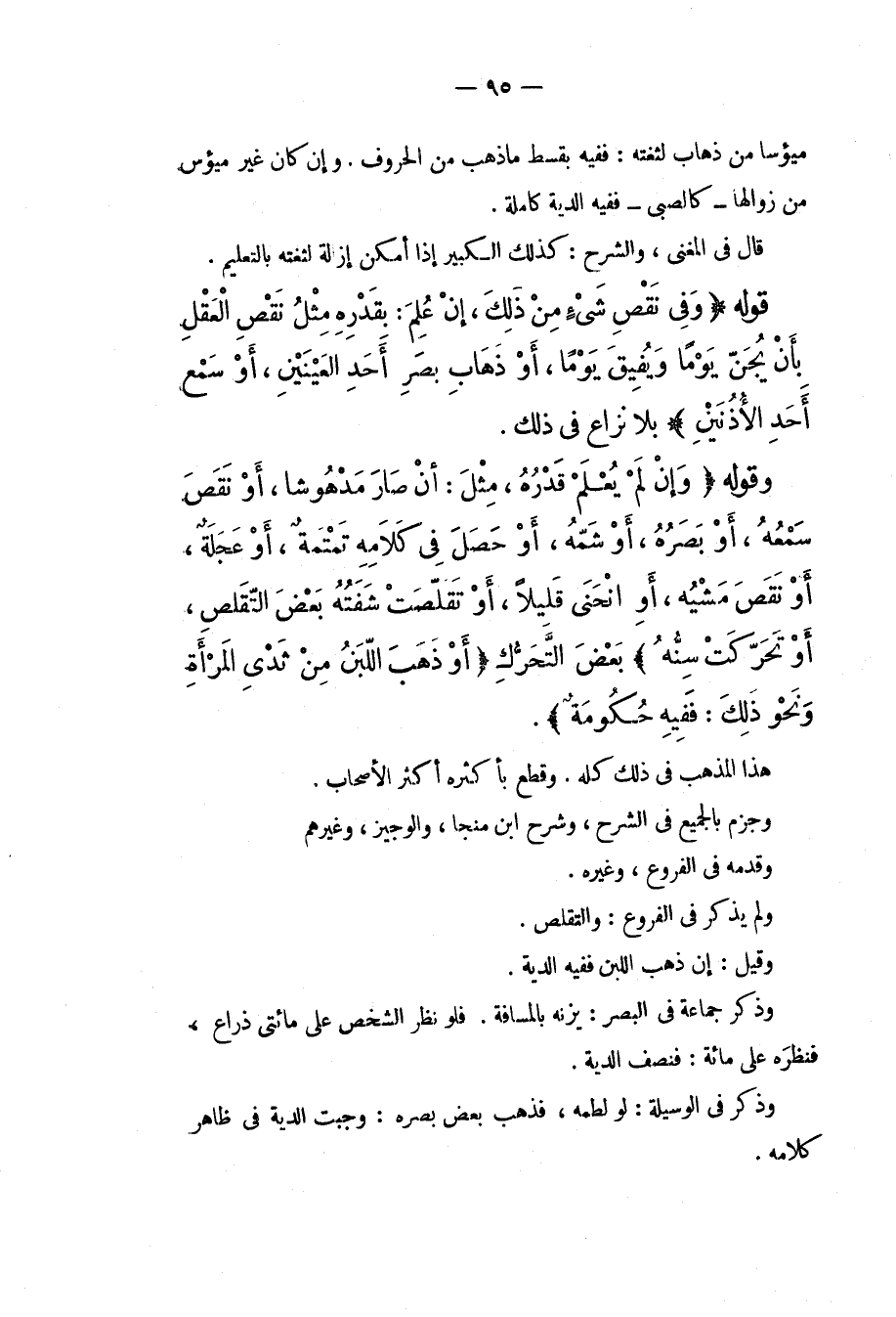 قَوْلُهُ (وَفِي نَقْصِ شَيْءٍ مِنْ ذَلِكَ، وَإِنْ عُلِمَ بِقَدْرِهِ مِثْلُ نَقْصِ الْعَقْلِ بِأَنْ يُجَنَّ يَوْمًا وَيُفِيقَ يَوْمًا، أَوْ ذَهَابُ بَصَرِ أَحَدِ الْعَيْنَيْنِ، أَوْ سَمْعِ أَحَدِ الْأُذُنَيْنِ) بِلَا نِزَاعٍ فِي ذَلِكَ. وَقَوْلُهُ (وَإِنْ لَمْ يُعْلَمْ قَدْرُهُ، مِثْلُ: أَنْ صَارَ مَدْهُوشًا، أَوْ نَقَصَ سَمْعُهُ، أَوْ بَصَرُهُ، أَوْ شَمُّهُ، أَوْ حَصَلَ فِي كَلَامِهِ تَمْتَمَةٌ، أَوْ عَجَلَةٌ، أَوْ نَقَصَ مَشْيُهُ، أَوْ انْحَنَى قَلِيلًا، أَوْ تَقَلَّصَتْ شَفَتُهُ بَعْضَ التَّقَلُّصِ، أَوْ تَحَرَّكَتْ سِنُّهُ) بَعْضَ التَّحَرُّكِ (أَوْ ذَهَبَ اللَّبَنُ مِنْ ثَدْيِ الْمَرْأَةِ وَنَحْوُ ذَلِكَ: فَفِيهِ حُكُومَةٌ) . هَذَا الْمَذْهَبُ فِي ذَلِكَ كُلِّهِ، وَقَطَعَ بِأَكْثَرِهِ أَكْثَرُ الْأَصْحَابِ، وَجَزَمَ بِالْجَمِيعِ فِي الشَّرْحِ، وَشَرْحِ ابْنِ مُنَجَّا، وَالْوَجِيزِ، وَغَيْرِهِمْ، وَقَدَّمَهُ فِي الْفُرُوعِ، وَغَيْرِهِ. وَلَمْ يَذْكُرْ فِي الْفُرُوعِ: وَالتَّقَلُّصَ. وَقِيلَ إنْ ذَهَبَ اللَّبَنُ فَفِيهِ الدِّيَةُ. وَذَكَرَ جَمَاعَةٌ فِي الْبَصَرِ: يَزِنُهُ بِالْمَسَافَةِ. فَلَوْ نَظَرَ الشَّخْصُ عَلَى مِائَتَيْ ذِرَاعٍ، فَنَظَرَهُ عَلَى مِائَةٍ: فَنِصْفُ الدِّيَةِ. وَذَكَرَ فِي الْوَسِيلَةِ: لَوْ لَطَمَهُ، فَذَهَبَ بَعْضُ بَصَرِهِ: وَجَبَتْ الدِّيَةُ فِي ظَاهِرِ كَلَامِهِ.
