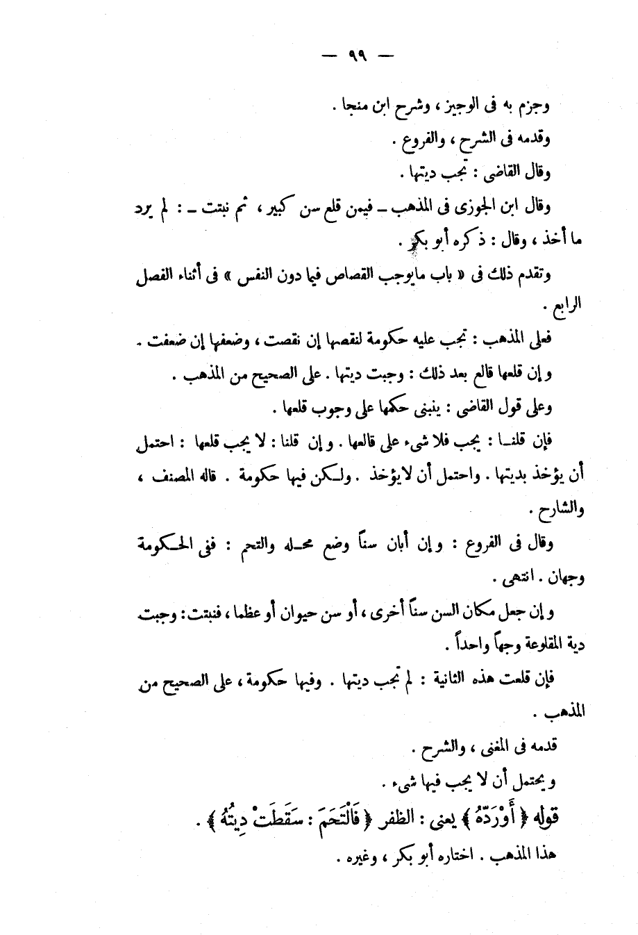 وَجَزَمَ بِهِ فِي الْوَجِيزِ، وَشَرْحِ ابْنِ مُنَجَّا. وَقَدَّمَهُ فِي الشَّرْحِ، وَالْفُرُوعِ. وَقَالَ الْقَاضِي: تَجِبُ دِيَتُهَا. وَقَالَ ابْنُ الْجَوْزِيِّ فِي الْمُذْهَبِ فِيمَنْ قَلَعَ سِنَّ كَبِيرٍ، ثُمَّ نَبَتَتْ: لَمْ يَرُدَّ مَا أَخَذَ، وَقَالَ: ذَكَرَهُ أَبُو بَكْرٍ. وَتَقَدَّمَ ذَلِكَ فِي " بَابُ مَا يُوجِبُ الْقِصَاصَ فِيمَا دُونَ النَّفْسِ " فِي أَثْنَاءِ الْفَصْلِ الرَّابِعِ. فَعَلَى الْمَذْهَبِ: تَجِبُ عَلَيْهِ حُكُومَةٌ لِنَقْصِهَا إنْ نَقَصَتْ، وَضَعْفِهَا إنْ ضَعُفَتْ. وَإِنْ قَلَعَهَا قَالِعٌ بَعْدَ ذَلِكَ: وَجَبَتْ دِيَتُهَا عَلَى الصَّحِيحِ مِنْ الْمَذْهَبِ. وَعَلَى قَوْلِ الْقَاضِي: يَنْبَنِي حُكْمُهَا عَلَى وُجُوبِ قَلْعِهَا. فَإِنْ قُلْنَا: يَجِبُ فَلَا شَيْءَ عَلَى قَالِعِهَا. وَإِنْ قُلْنَا: لَا يَجِبُ قَلْعُهَا: احْتَمَلَ أَنْ يُؤْخَذَ بِدِيَتِهَا. وَاحْتَمَلَ أَنْ لَا يُؤْخَذَ. وَلَكِنْ فِيهَا حُكُومَةٌ. قَالَهُ الْمُصَنِّفُ، وَالشَّارِحُ. وَقَالَ فِي الْفُرُوعِ: وَإِنْ أَبَانَ سِنًّا وُضِعَ مَحَلَّهُ وَالْتَحَمَ: فَفِي الْحُكُومَةِ، وَجْهَانِ. انْتَهَى. وَإِنْ جَعَلَ مَكَانَ السِّنِّ سِنًّا أُخْرَى، أَوْ سِنَّ حَيَوَانٍ أَوْ عَظْمًا، فَنَبَتَتْ: وَجَبَتْ دِيَةُ الْمَقْلُوعَةِ وَجْهًا وَاحِدًا. فَإِنْ قُلِعَتْ هَذِهِ الثَّانِيَةُ: لَمْ تَجِبْ دِيَتُهَا. وَفِيهَا حُكُومَةٌ، عَلَى الصَّحِيحِ مِنْ الْمَذْهَبِ قَدَّمَهُ فِي الْمُغْنِي، وَالشَّرْحِ. وَيَحْتَمِلُ أَنْ لَا يَجِبَ فِيهَا شَيْءٌ. قَوْلُهُ (أَوْ رَدَّهُ) يَعْنِي: الظُّفْرَ (فَالْتَحَمَ: سَقَطَتْ دِيَتُهُ) . هَذَا الْمَذْهَبُ. اخْتَارَهُ أَبُو بَكْرٍ، وَغَيْرُهُ.
