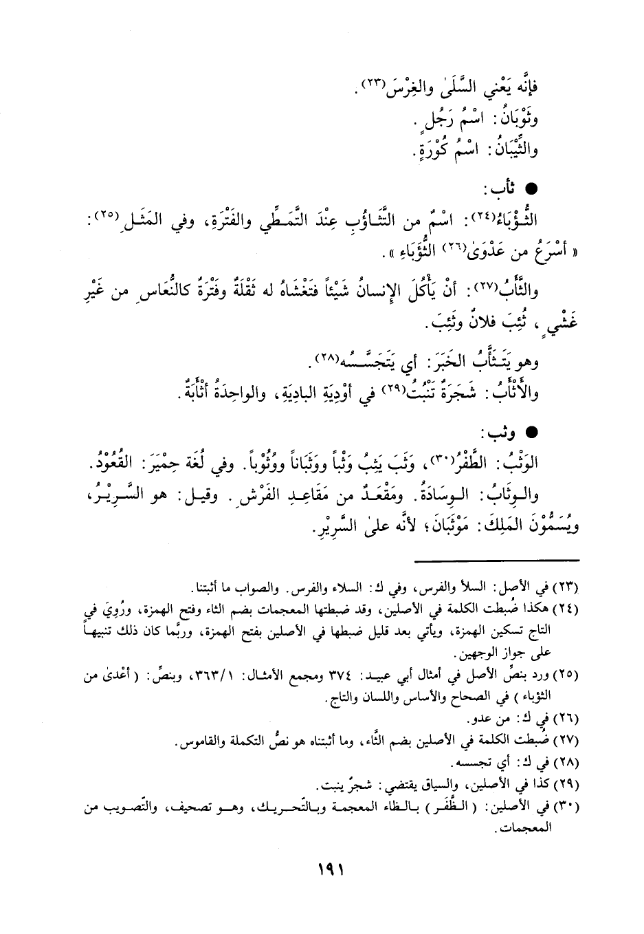 ُ فإنَّه يَعْني السَّلَى والغِرْسَ . وثَوْبَانُ : اسْمُ َجُلٍ . والثِّيْبَانُ : اسْمُ كُوْرَةٍ . ثأب : الثُّؤْبَاءُ : اسْمٌ من التَّثَاؤُبِ عِنْدَ التَّمَطِّي والفَتْرَةِ ، وفي المَثَلِ : ' أسْرَعُ من عَدْوَى الثُّؤَبَاءِ ' . والثَّأَبُ : أنْ يَأْكُلَ الإِنسانُ شَيْئاً فتَغْشَاهُ له ثَقْلَةٌ وفَتْرَةٌ كالنُّعَاسِ من غَيْرِ غَشْيٍ ، ثُئِبَ فلانٌ وثَئِبَ . وهو يَتَثَأَّبُ الخَيْرَ : أي يَتَجَسَّسُه . والأَثْأَبُ : شَجَرَةٌ تَنْبُتُ في أوْدِيَةِ البادِيَةِ ، والواحِدَةُ أثْأَبَةٌ . وثب : الوَثْبُ : الطَّفْرُ ، وَثَبَ يَثِبُ وَثْباً ووَثَبَاناً ووُثُوْباً . وفي لُغَة حِمْيَرَ : القُعُوْدُ . والوِثَابُ : الوِسَادَةُ . ومَقْعَدٌ من مَقَاعِدِ الفَرْشِ . وقيل : هو السَّرِيْرُ ، ويُسَمُّوْنَ المَلِكَ : مَوْثَبَانَ ؛ لأنَّه على السَّرِيْرِ .