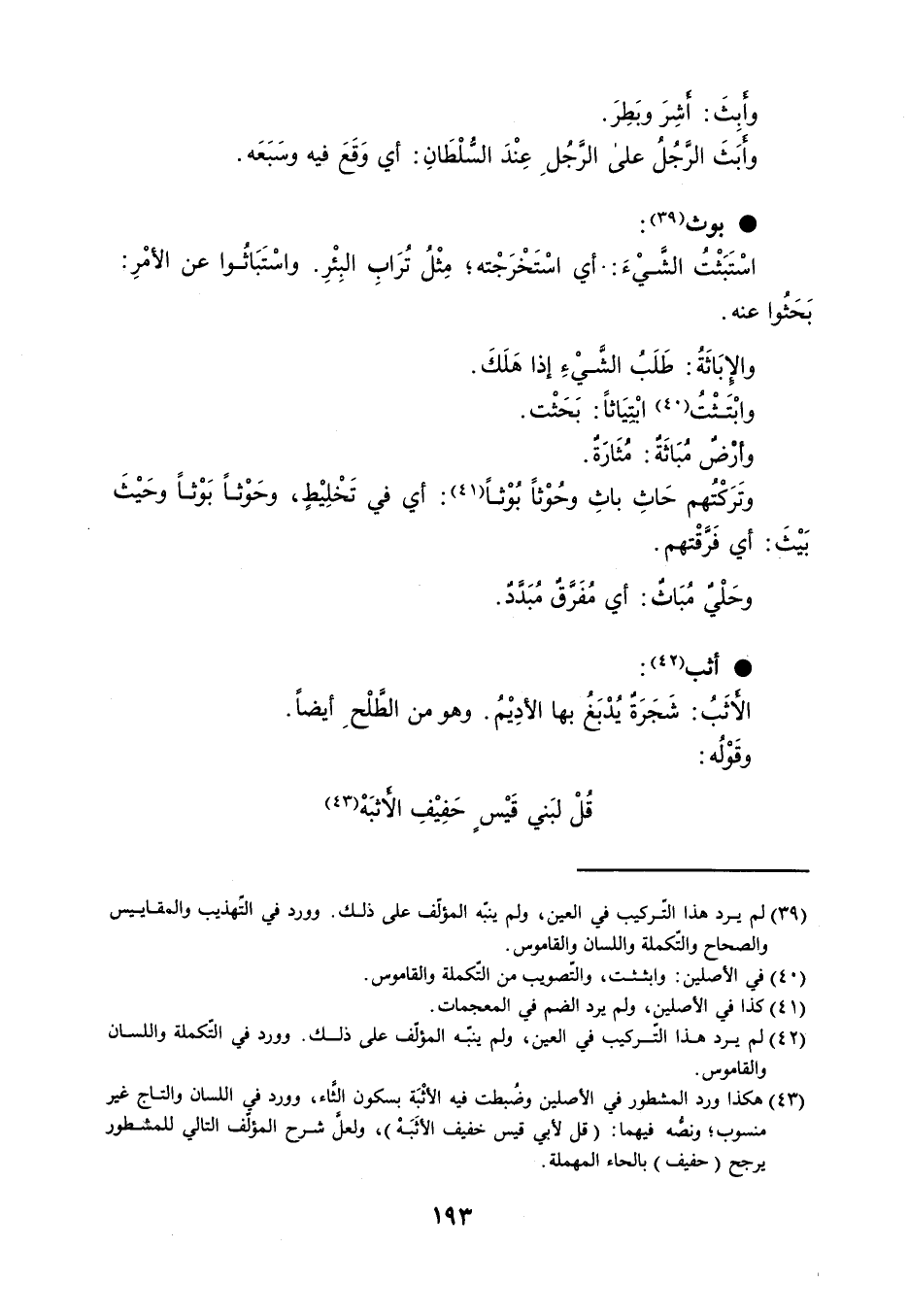 أَشِرَ وبَطِرَ . وأَبَثَ الرَّجُلُ على الرَّجُلِ عِنْدَ السُّلْطَانِ : أي وَقَعَ فيه وسَبَعَه . بوث : اسْتَبَثْتُ الشَّيْءَ : أي اسْتَخْرَجْته ؛ مِثْلُ تُرَابِ البِئْرِ . واسْتَبَاثُوا عن الأمْرِ : بَحَثُوا عنه . والإِبَاثَةُ : طَلَبُ الشَّيْءِ إذا هَلَكَ . وابْتَثْتُ ابْتِيَاثاً : بَحَثْت . وأرْضٌ مُبَاثَةٌ : مُثَارَةٌ . وتَرَكْتُهم حَاثِ باثِ وحُوْثاً بُوْثاً : أي في تَخْلِيْطٍ ، وحَوْثاً بَوْثاً وحَيْثَ بَيْثَ : أي فَرَّقْتهم . وحَلْيٌ مُبَاثٌ : أي مُفَرَّقٌ مُبَدَّدٌ . أثب : الأَثَبُ : شَجَرَةٌ يُدْبَغُ بها الأدِيْمُ . وهو من الطَّلْحِ أيضاً . وقَوْلُه : قُلْ لبَني قَيْسٍ حَفِيْفِ الأَثبَه